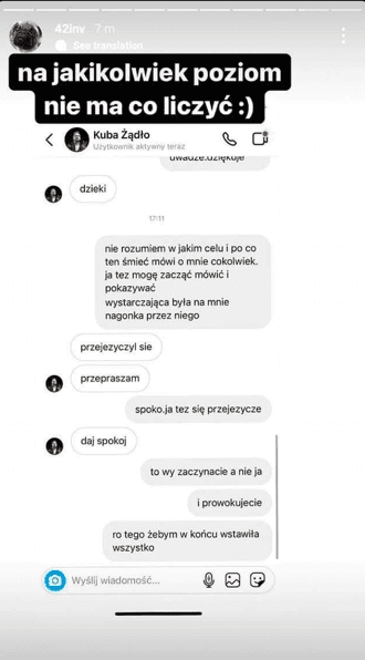 „- Zjebałeś mi życie. Skrzywdziłeś pod każdym względem. Już nic gorszego zrobić nie mogłeś. Co ty masz za poziom? Co z ciebie za człowiek? Obydwoje wiemy i wszyscy, którzy b yli obecni w tym „związku”, jak było. Gdyby ludzie wiedzieli, to oni by cię jebali. Nigdy ci nie wybaczę. Dwa miesiące temu ryczysz, a teraz mnie nie lubisz. Chore”, napiała na InstaStories.