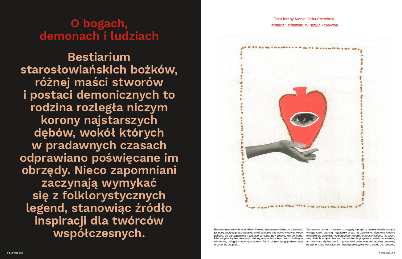 Przez cały numer odkopujemy słowiańskie pojęcia, mity i archetypy. Rozkładamy je na części pierwsze, by głębiej zrozumieć i świadomie wejść w ten baśniowy świat przeszłości. Milena Liebe w swoim cyklu odkrywania ciekawych postaci skupia się na rodzimych rzemieślnikach kulinarnych. Za tą tajemniczą etykietką kryją się domorośli fascynaci grzebania w starych przepisach i podawania ich we współczesnej formie. Udało nam się też zadać dosłownie kilka pytań najsłynniejszej rodzimej artystce skupiającej się na naszym folku i związanych z nim wierzeniach – Aleksandrze Waliszewskiej. Malarka raczej nie udziela wywiadów, więc obudowaliśmy to opowieścią naszego specjalisty w temacie, Marka Staszyca. Odwiedzamy również sielskie mieszkanko aktorki Oriny Krajewskiej, a także rozmawiamy z gwiazdą rozdania naszych K MAG-owych nagród „Moskity” – piosenkarką Anią Leon.