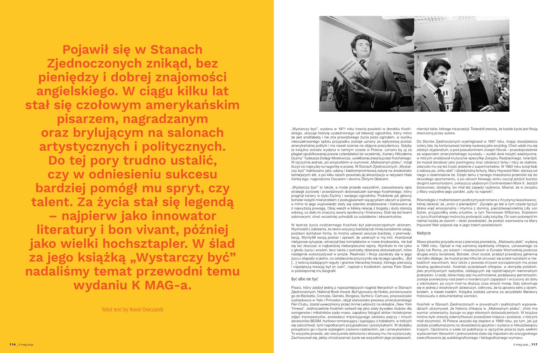 W tych dziwnych czasach, gdy pandemia do granic możliwości zepchnęła nasze życie do funkcjonowania w sieci, a praca i prywata zaczęły zlewać się w jedno, ograniczeni kanapą i tym czy innym ekranem rozglądamy się za czymś bardziej prawdziwym. Przesyciliśmy się blichtrem i social mediową sztucznością, funkcjonowaniem dla poklasku innych, kolejnymi lajkami. Zawodowo już chyba nie ma od tego ucieczki, ale w życiu prywatnym jak najbardziej. Tęsknimy za normalnością i śmiemy twierdzić, że bycie zwyczajnym jest cool! Paradoksalnie to właśnie covidowe czasy sprawiły, że normalność stała się towarem iście pożądanym. My już od lat promujemy naturalność i proponujemy ucieczkę od budowania swojego jestestwa przy pomocy Photoshopa, ale w tym wydaniu stawiamy również na relacje oraz idące za nimi szczere emocje. Za temat przewodni obraliśmy tytuł kultowej powieści Jerzego Kosińskiego, „Wystarczy być”, wraz z hollywoodzką adaptacją o tym samym tytule. Dlaczego? Ponieważ to hasło idealnie scala wszystkie myśli, które przyświecały redakcji w trakcie tworzenia bieżącego K MAG-a. Samego pisarza i jego skomplikowane życie wspominamy w świetnym tekście Karola Owczarka, lecz reszta numeru daleka jest od mroku tej postaci. Skupiamy się na pozytywnym przesłaniu i ludzkiej potrzebie korzystania z życia. Na bohaterów okładkowych wybraliśmy wyjątkową parę artystów, słynącą z radości zwykłego życia i doceniania rzeczywistości taką, jaka jest. Anka i Wilhelm Sasnal przeszli razem całe dorosłe życie – od początków twórczych aż do szczytu światowego uznania. Mogli i wciąż mogą mieszkać w dowolnym miejscu na świecie, a jednak postawili na krakowskie peryferia i skromność. O tym i wielu innych wyborach, uciechach i pokusach życia opowiadają nam w okładkowym wywiadzie. Tuż obok Kasper Cecha-Czerwiński prognozuje, jak będzie wyglądał postpandemiczny świat, jak skorzystamy z doświadczeń ostatnich miesięcy, jakie stoją przed nami zagrożenia, a jakie możliwości. Wciągający tekst swoimi marzycielskimi zdjęciami pożądanej normalności i nadziei ozdobił uznany artysta Szymon Rogiński.