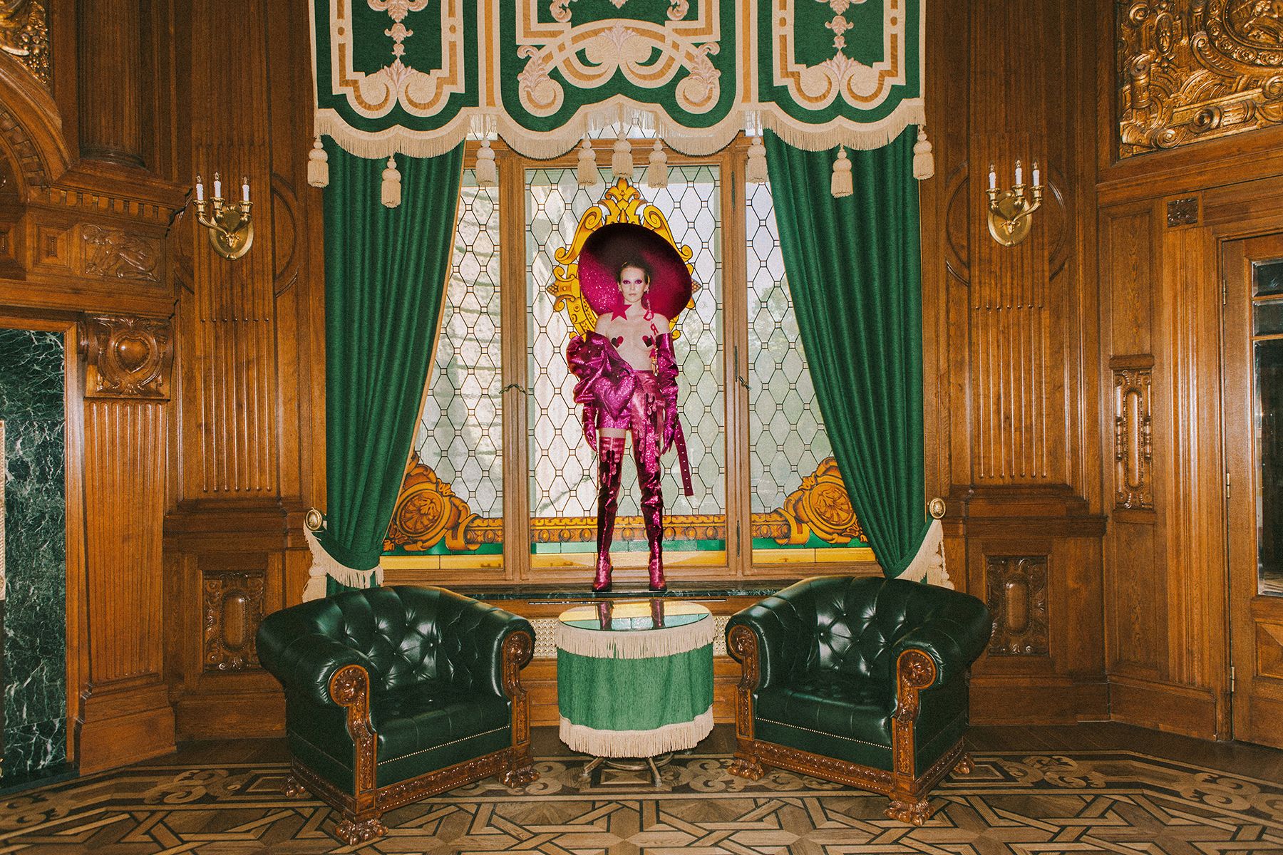 „Użyłem błyszczących dzianin, tkanin pokrytych brokatem oraz dzianiny lureksowej. Podczas tworzenia konstrukcji poszczególnych asortymentów starałem się jak najbardziej wyjść w przestrzeń otaczającą sylwetkę, aby formy sprawiały wrażenie przestrzennych rzeźb kryjących ludzkie ciało. W kolekcji pojawia się motyw dłoni, który symbolizuje zaciskające się „sidła” słabości, na które człowiek jest narażony. Przestrzenne gwiazdy i serca interpretują emotikony, których społeczeństwo nadmiernie używa w relacjach międzyludzkich” – mówi Adrian Krupa.