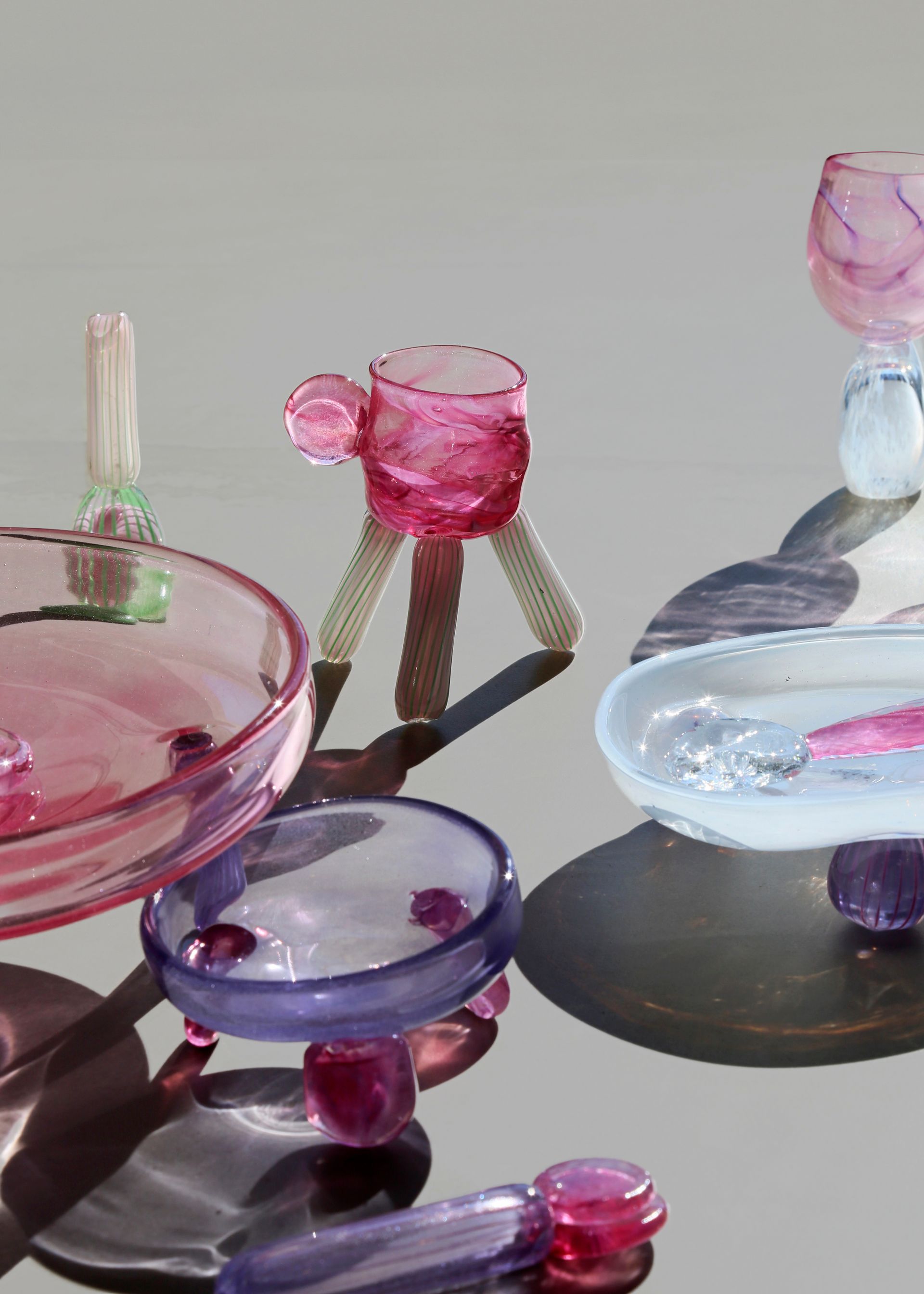 Tytułowy romans pomiędzy rzemieślnikiem i rzemieślniczką objawia się w zestawieniu delikatnych wstążek i koronkowych wzorów z chłodem metalu i topornością drewna. To dowód na to, że, jak mówią, w miłości przeciwieństwa się przyciągają. Podczas wydarzenia można było także obejrzeć kolekcję naczyń zaprojektowaną razem z Emmą Batschevą, z którą Basia współtworzy studio kreatywne Grains of Us. Kolekcjonerski dizajn przeplata polską kulturę z francuską, a tradycyjną technikę dmuchanego szkła z radosnymi i zaskakującymi formami. Kolorowe kubki, miski, karafki i mieszadełka wprowadzają jednocześnie elegancję i zabawę do codziennego życia. Zabawa w piasku z dziecięcych wspomnień powraca w ich pracowni jako artystyczny proces.