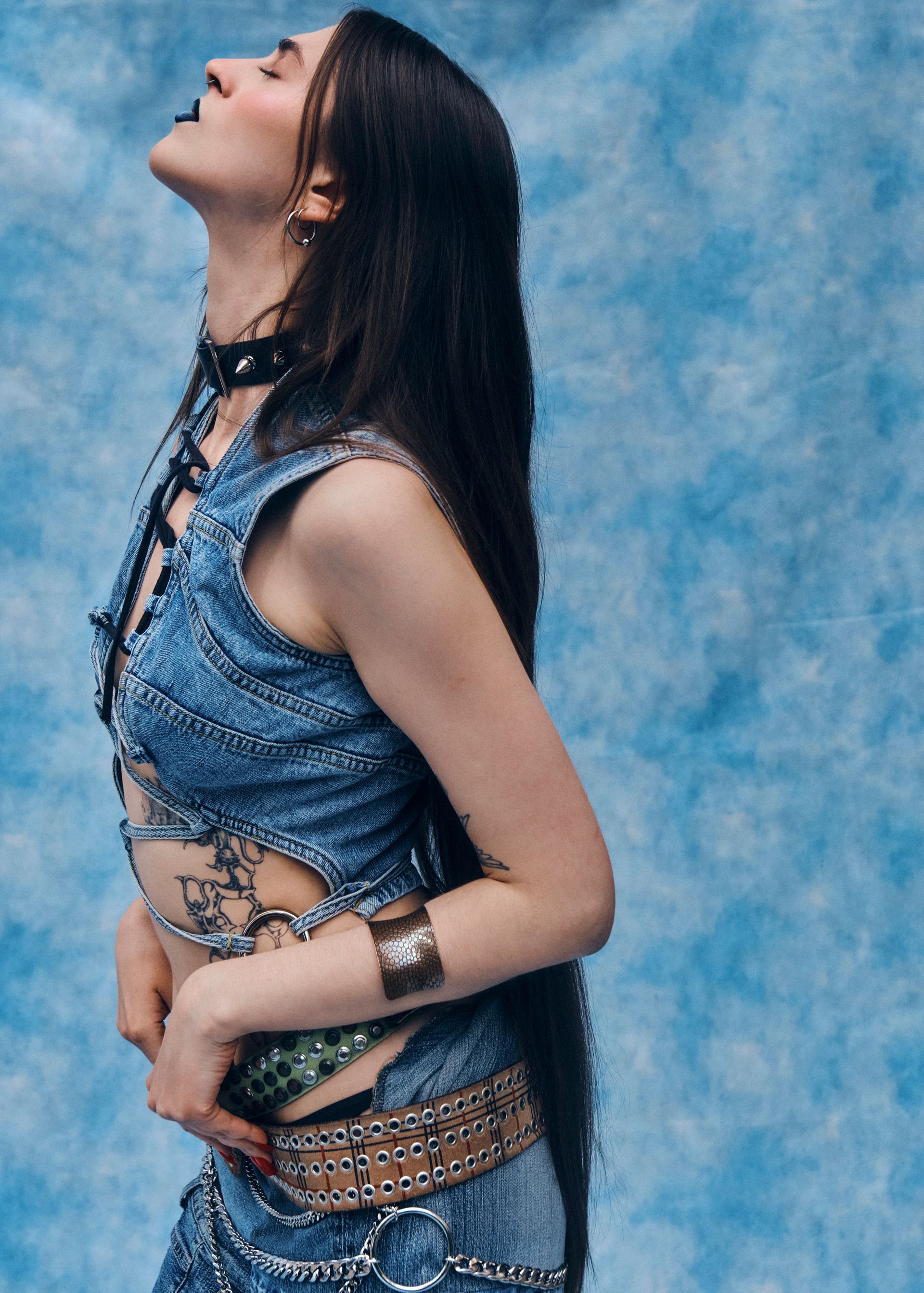 House of Slay to ironiczny dom mody. Powstał z buntu, a ubrania z niego zwykle odkrywają to, co zakryte, i stają w opozycji do praktyczności. Największym wydarzeniem związanym z tym projektem był pokaz S.Z.A.F.A. THE FASHION EXPERIENCE w Teatrze Powszechnym w Warszawie. Zorganizowałam go, mając osiemnaście lat. Dzięki kolektywowi INSZPER uszyłam wszystkie sylwetki, postawiłam scenę, lowkey choreografowałam moich wspaniałych performerów, reżyserowałam, performowałam… To było crazy. Oprócz tego House of Slay tworzyło cykliczny projekt SlayHigh oraz TightS. Ten ostatni polegał na przetwarzaniu przeze mnie odpadków z fabryki rajstop – ręcznie je farbowałam, cięłam i tworzyłam z nich formy z bardzo ciekawą fakturą.