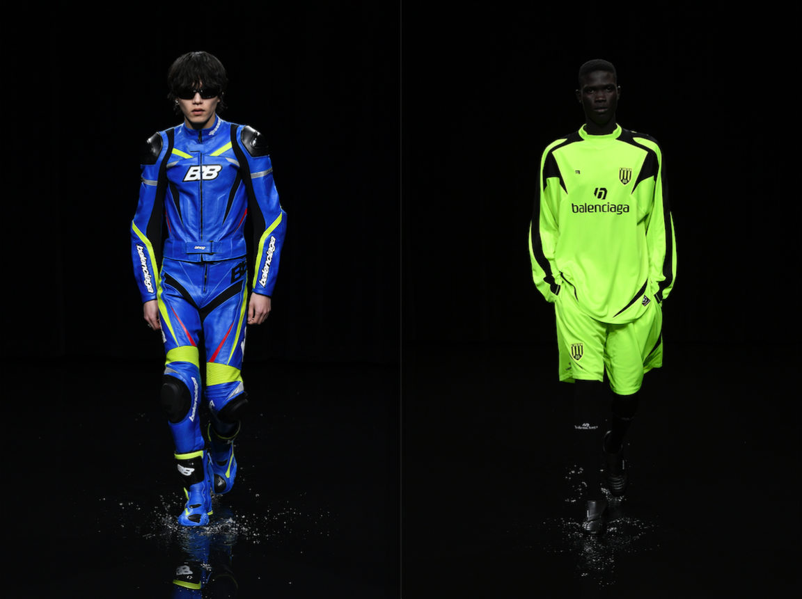 W wizji dyrektora kreatywnego Balenciagi – jak najbardziej. Drugim filarem kolekcji – poza kastą duchowną – stało się globalne ocieplenie i podnoszący się poziom mórz. Wyłożony LED-owymi ekranami sufit płonął ogniem piekielnym, a z ciemności wyłaniały się kolejne demony globalnego ocieplenia. Przechadzający się po wybiegu modele rozpryskiwali wokół siebie wodę – niektórzy w wodoodpornych butach, inni na szpilkach. Nosili neoprenowe płaszcze ze skompresowaną talią i znane każdemu wielbicielowi Baleciagi Pantaboots, wprawnie zestawione z „pasami cnoty”. Do tego spiczaste, przeskalowane ramiona i odzież sportowa. Dostaliśmy też całą serię skórzanych strojów motocyklowych, jak gdyby zaprojektowanych dla jeźdźców apokalipsy – ale w wersji nowoczesnej, jednośladowej.