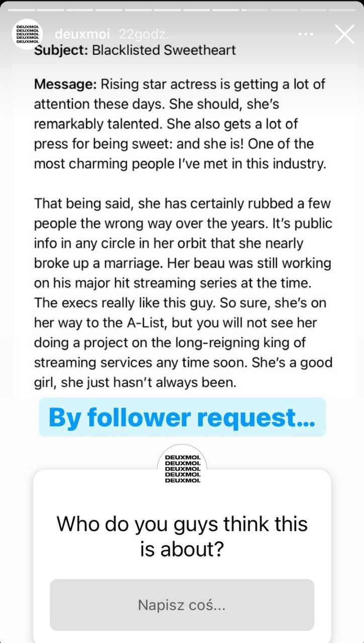 „– Wszystkie informacje publikowane na tym koncie są niepotwierdzone. Deuxmoi nie twierdzi, że informacje publikowane na tym koncie są prawdziwe”, możemy przeczytać w bio.