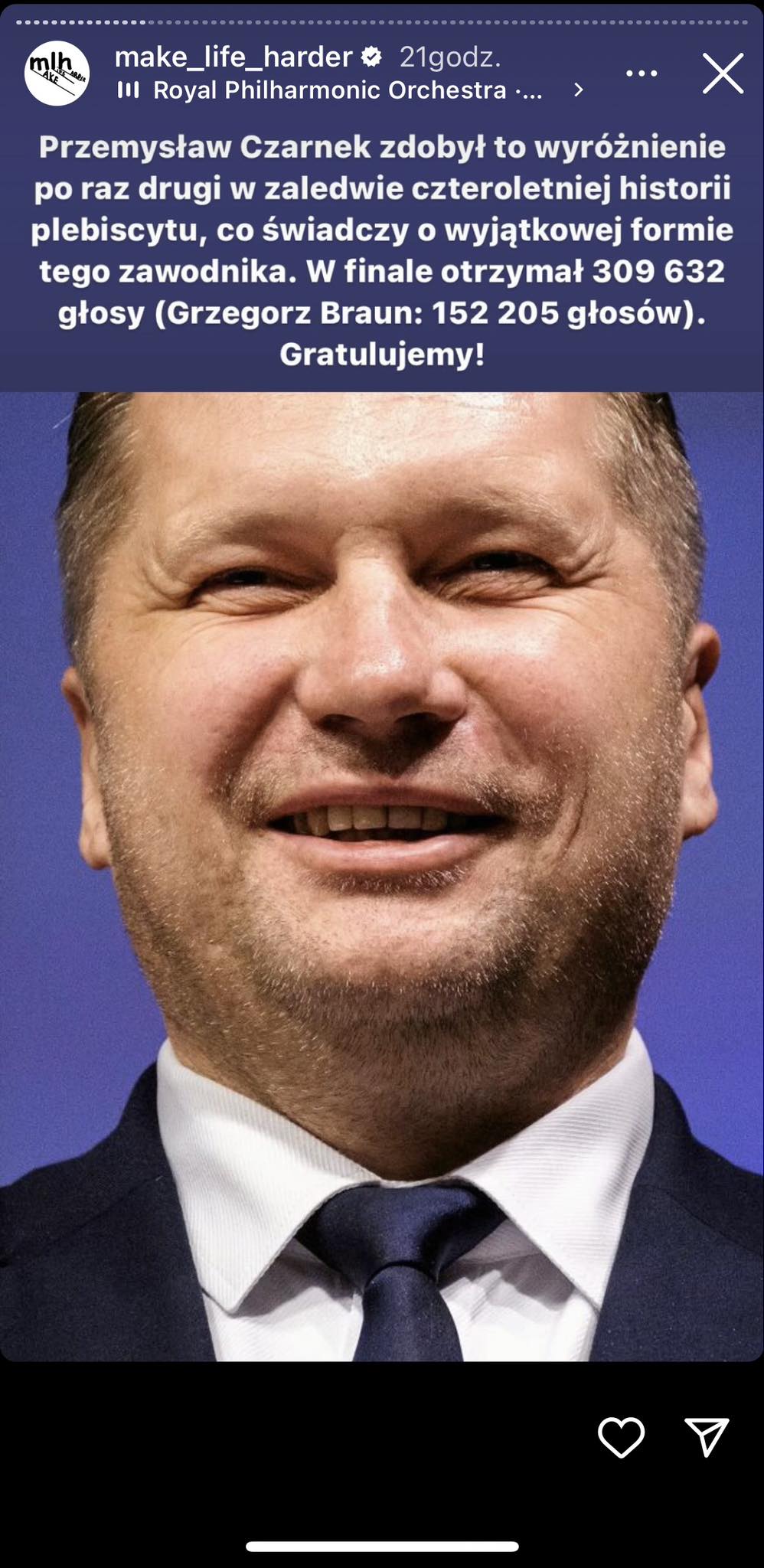 „Przemysław Czarnek zdobył to wyróżnienie po raz drugi w zalewie czteroletniej historii plebiscytu, co świadczy o wyjątkowej formie tego zawodnika. W finale otrzymał 309 632 głosy (Grzegorz Braun: 152 205 głosów). Gratulujemy!”, przekazał profil Make Life Harder.