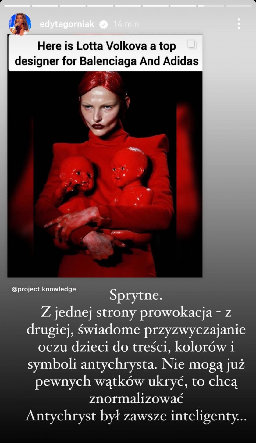 Z jakiegoś powodu głos zabrała również Edyta Górniak, która obecnie jest bardziej znana z głoszenia teorii spiskowych, niż swojej twórczości. Gwiazda udostępniła na InstaStories post profilu @project.knowledge, którego bohaterką jest Lotta Volkova. Na zdjęciu widać kobietę, ubraną w czerwony lateksowy strój, która trzyma dwie lalki, pokryte sztuczną krwią. „To jest Lotta Volkova, główna projektantka Balenciagi oraz Adidasa” – głosi podpis.