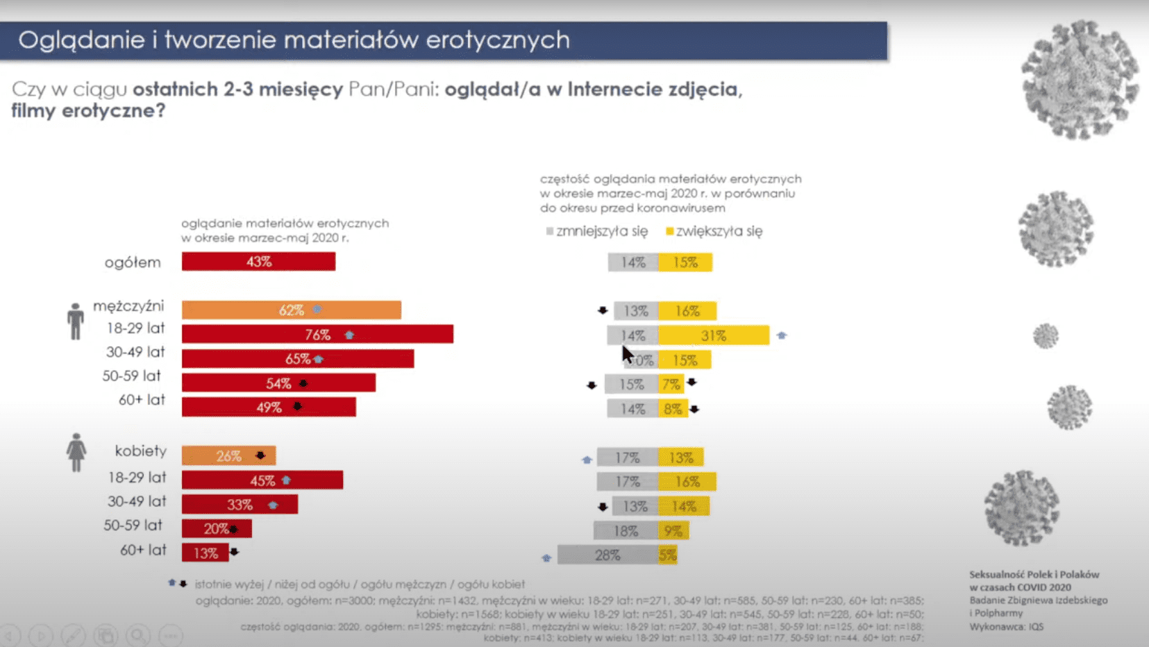 Z jednej strony pracownice seksualne są traktowane z pogardą, a z drugiej – wszyscy oglądają porno. W badaniu„Seksualność Polek i Polaków w czasach COVID" prof. Zbigniewa Izdebskiego i Polpharmy 43 proc. Polaków zadeklarowało, że ogląda materiały pornograficzne (62 proc. mężczyzn i 26 proc. kobiet). Raport opracował prof. Izdebski, znany seksuolog oraz kierownik Katedry Biomedycznych Podstaw Rozwoju i Seksuologii na Wydziale Pedagogicznym Uniwersytetu Warszawskiego. Badanie dotyczyło okresu marzec-maj 2020 i wzięło w nim udział 3 tys. osób. Warto dodać także, że w 2020 roku Polska znalazła się na 15. miejscu wśród krajów, których mieszkańcy w 2020 roku najczęściej odwiedzali portal PornHub.