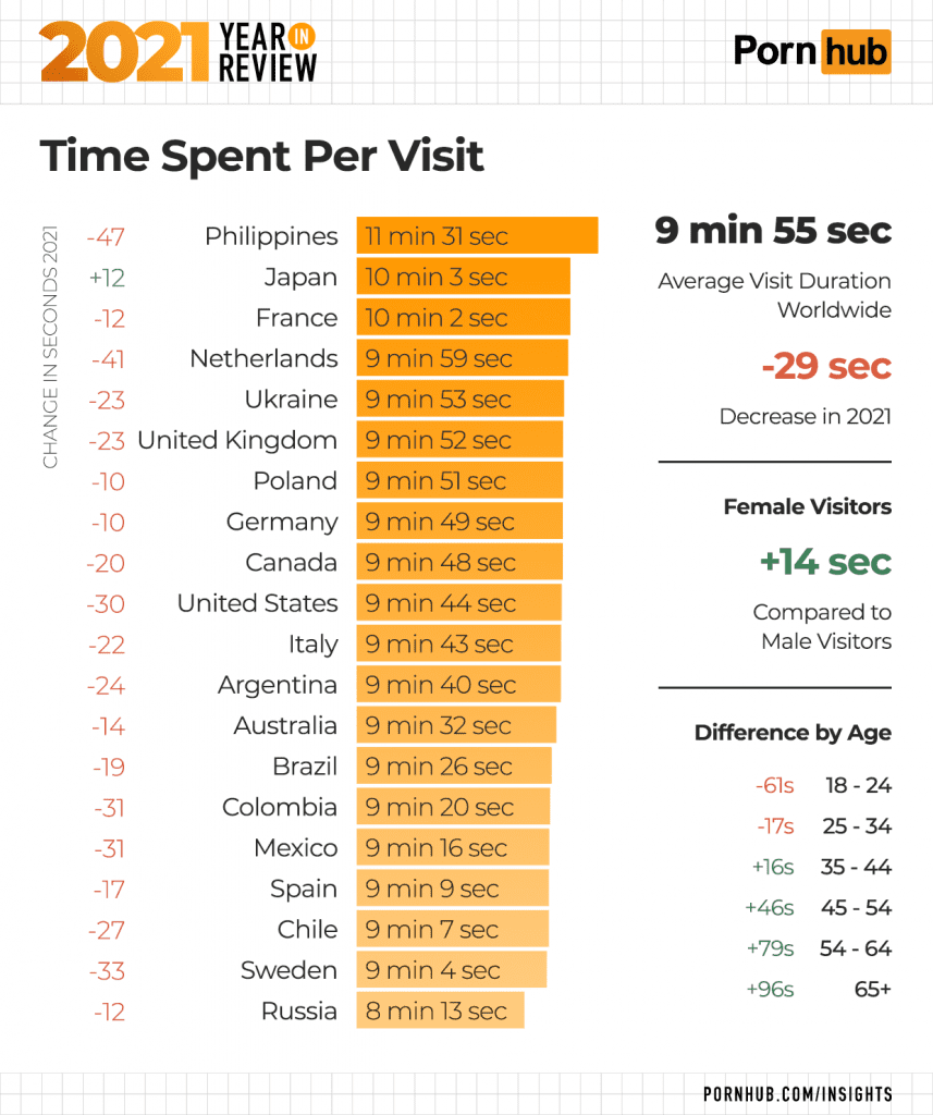 Naszego kraju nie zabrakło również w zestawieniu 20 krajów generujących największy ruch na Pornhubie. Polska zajmuje obecnie 13 miejsce, co oznacza, że awansowaliśmy o jedną pozycję. Jeżeli chodzi o czas spędzony na stronie, to nasz kraj znalazł się na 7. miejscu. Jak podaje Pornhub, wynosi on 9 minut i 51 sekund. Warto zauważyć, że Polki stanowią 32 proc. polskich wszystkich odwiedzających.