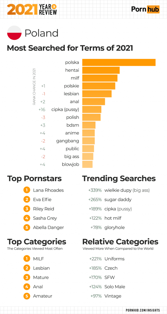W 2021 roku najczęściej wyszukiwane hasło to „hentai", które znalazło się w pierwszej dziesiątce najczęściej wyszukiwanych haseł w niemal wszystkich krajach i wyprzedziło zeszłorocznego zwycięzcę, czyli słowo „japanese". Za nimi znajdują się frazy „lesbian" oraz „milf", a pierwszą piątkę zamyka „pinay", czyli Filipinka. Ta ostatnia awansowała na przestrzeni ostatniego roku aż o 13 miejsc.