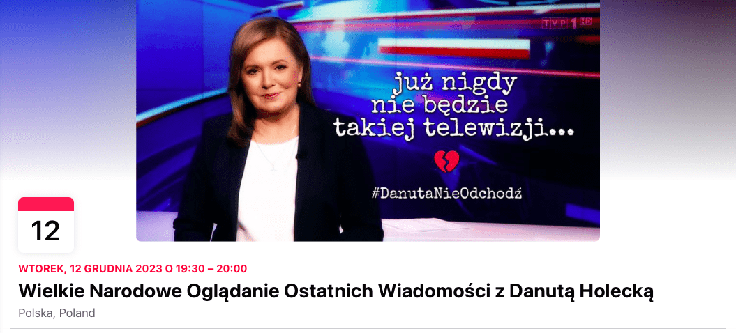 „Szanowni Państwo, to straszne. Niekwestionowana Królowa Polskiego Kineskopu odchodzi! Bądźmy z Nią w trakcie jej ostatniego występu! Bijmy rekord oglądalności dla Danuty!#DanutaNieOdchodź! P.S. Data może się jeszcze zmienić, Szanowni Państwo, obiecujemy, że będziemy trzymać Rękę na Pulsie”, czytamy w opisie.
