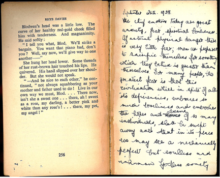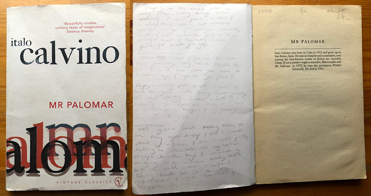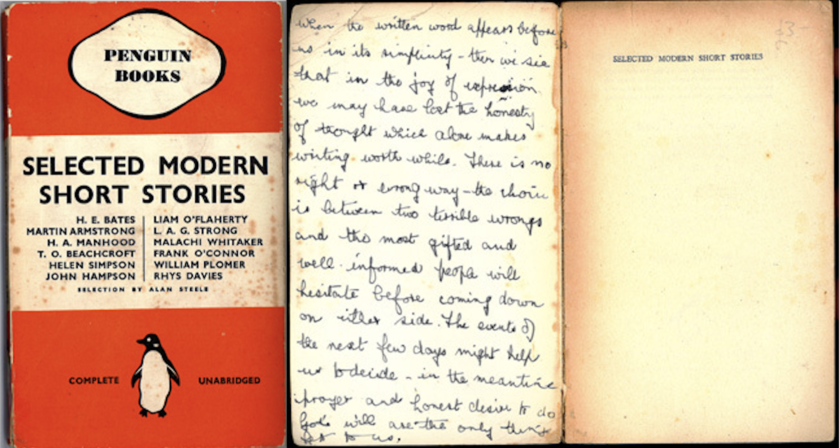„Wreszcie coś naprawdę ważnego. Sama książka nie należy do najpiękniejszych: niechlujna zbieranina »Modern Short Stories« wydawnictwa Penguin, pomarańczowe i białe pasy poplamione przez lata i złamany grzbiet, który ledwo trzyma to wszystko razem. Nie spojrzelibyście na nią nawet raz, gdybyście natknęli się na nią w antykwariacie (dlatego jestem wdzięczy dobrym ludziem zeSkoob Booksza danie mi cynku w tej sprawie). A jednak wiadomość w niej zawarta jest niecodzienna. Ciasnym pismem zapisane są całe dwie stronice.” Dzięki uprzejmości W. B. Gooderhama