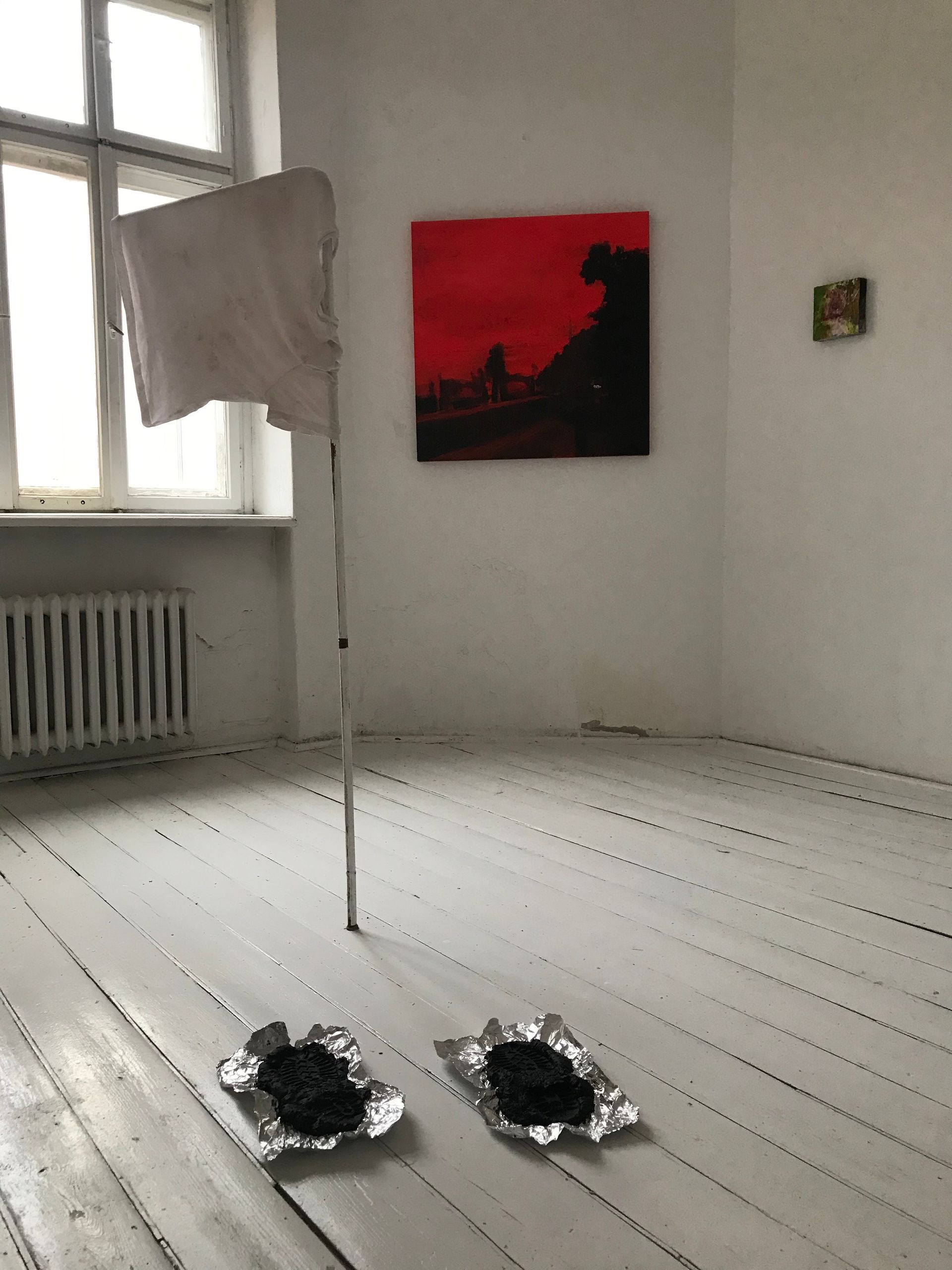 „Ostatni człowiek na Ziemi”, Misha Waks: Nawiązanie do lądowania człowieka na Księżycu („The First Man On The Moon”). Wybieramy się podbijać kolejne planety, a tymczasem ta, na której żyjemy, ulega degradacji. Staram się wyobrazić sobie, co by zrobił ostatni człowiek na Ziemi. Jaki ślad by po sobie zostawił? Ja wywieszam białą flagę na znak poddania się w walce z naszym ego.