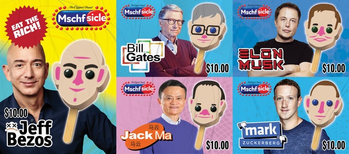 MSCHF, amerykański kolektyw artystyczny stworzył nowy, kontrowersyjny produkt na lato, czyli lody z podobizną największych miliarderów na świecie. W ofercie można znaleźć twarz między innymi Billa Gatesa, Elona Muska, Jeffa Bezosa, czy Marka Zuckerberga.