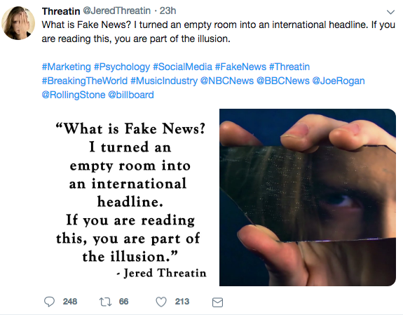 Zignorujmy jakość całego klipu oraz piosenki. Wystarczy spojrzeć na, ewidentnie fejkowe, komentarze "fanów", którzy życzą m.in. Jared Threatin "dotknął ich chociaż raz zanim umrą". Oficjalna strona Threatin jest z kolei początkiem sieci, także nieautentycznych, witryn, która mają uwiarygadniać wizerunek multiinstrumentalisty jako wielkiej gwiazdy współczesnego rocka.