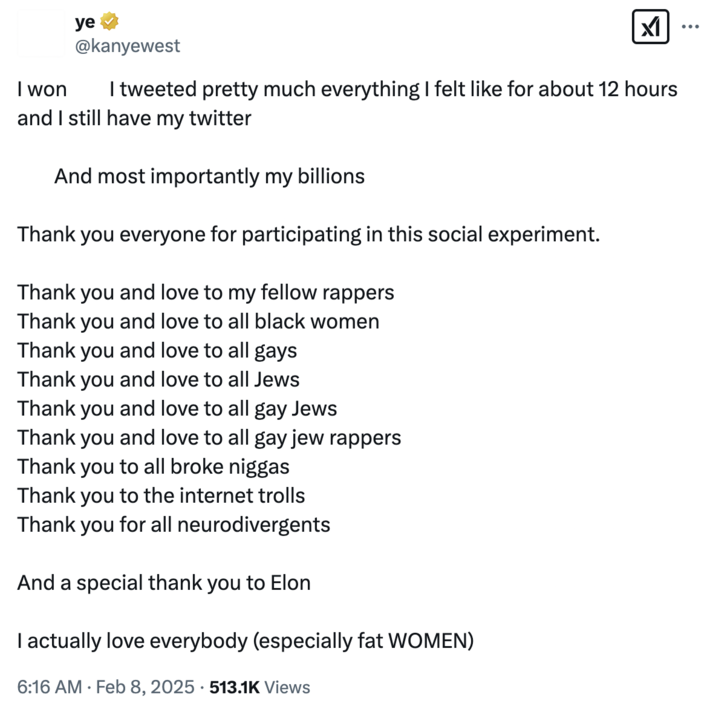 Najdziwniejsze w tym wszystkim, okazało się zakończenie tego monologu. W jednym z ostatnich swoich tweetów, Ye stwierdził, że wszystko co napisał było tak naprawdę eksperymentem społecznym, którego celem było udowodnienie, że może powiedzieć co zechce i w dalszym ciągu nie zostanie usunięty z platformy X. Podziękował również wszystkim stronom, które obraził i zaznaczył, że tak naprawdę kocha wszystkich ludzi.