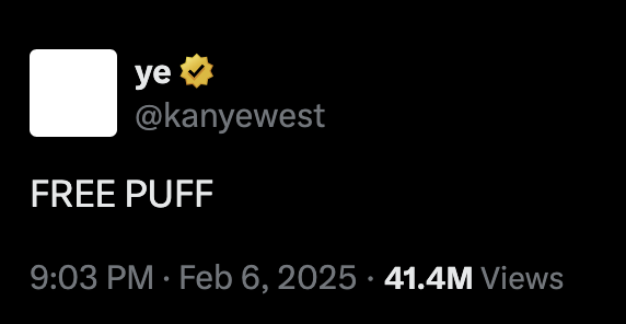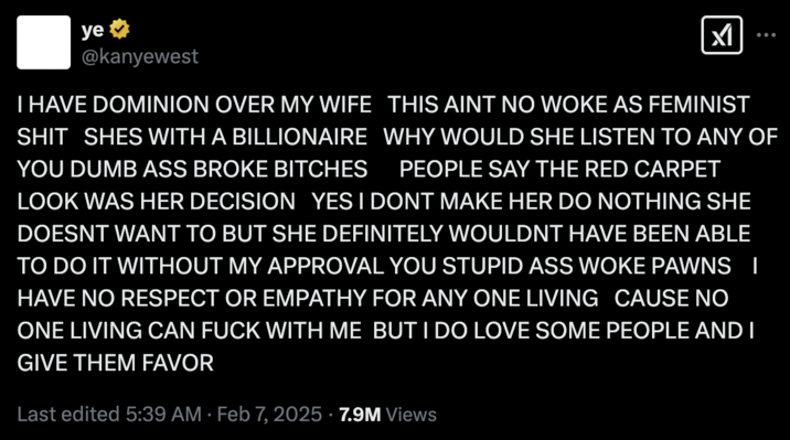 Raper napisał o tym, że ma całkowitą „władzę” nad swoją żoną, a także poparł Elona Muska, gloryfikując jego gest podczas inauguracji, jednocześnie oskarżając właściciela Tesli, o odebranie mu jego „nazistowskiego swagu”.