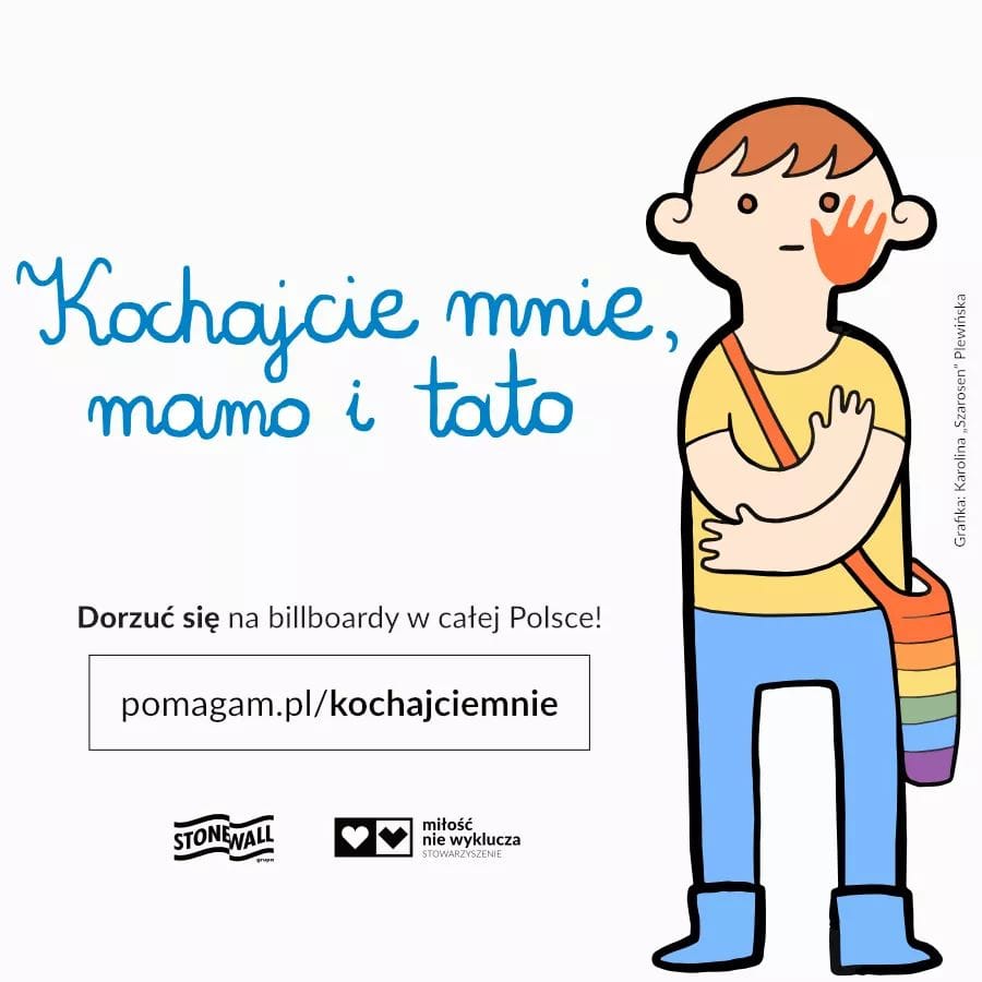 To oddolna inicjatywa ze zbiórką w serwisie pomagam.pl, lecz w zaledwie 2 dni udało się zebrać ponad 400 000 zł. Na początek billboardy zawisną w Warszawie i Poznaniu, ale organizatorzy chcą, by hasło „Kochajcie mnie, mamo i tato” pojawiło się w jak największej liczbie miejsc w całym kraju. Autorką pomysłu i obrazka na plakaty jest Karolina „Szarosen” Plewińska.