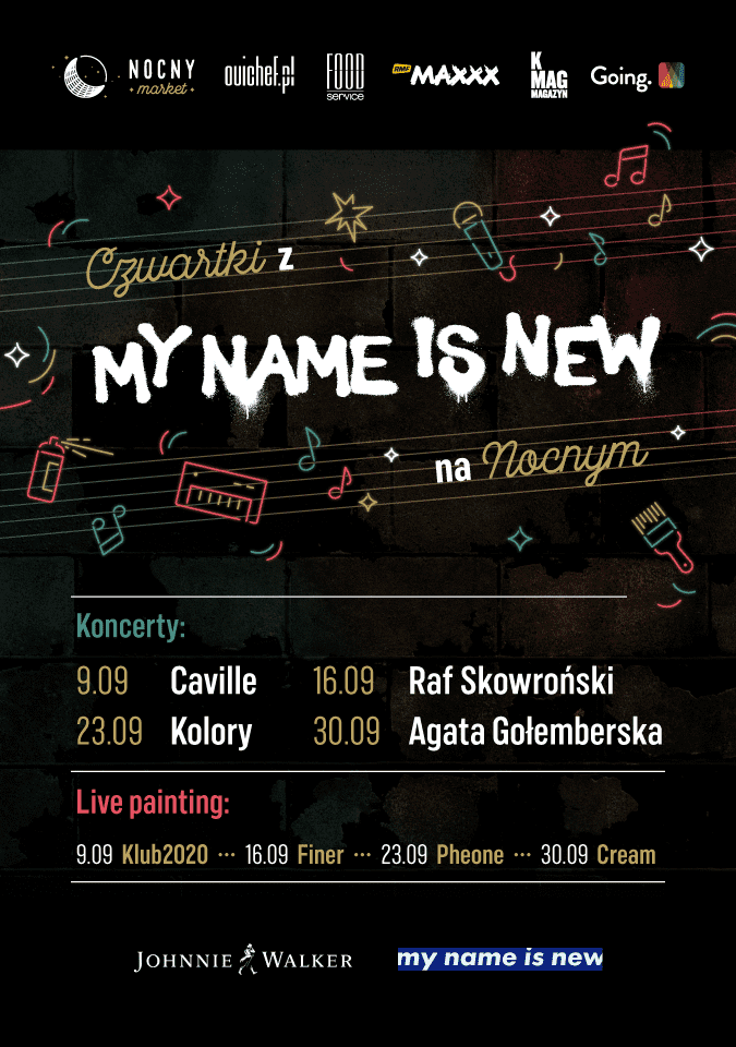 Wrześniowe czwartki na Nocnym nie będą stały tylko pod znakiem najlepszego street foodu, ale też pod znakiem sztuki i koncertów młodych artystów należących do projektu My Name is New, który promuje nową i niezależną muzykę oraz nietuzinkowych artystów. Cały projekt jest stworzony jest przez wytwórnię i management Kayax, który zajmuje się takimi artystami jak Daria Zawiałow, Hey, Julia Wieniawa, Krzysztof Zalewski, Mary Spolsky, Nosowska czy siostry Przybysz. Ich innowacyjny projekt My Name is New powstał z myślą o promowaniu najlepszej muzyki początkujących zespołów i artystów solowych, co z powodzeniem robi już od kilku lat. W każdy czwartek na Nocnej scenie usłyszeć będzie można cztery zespoły, których występy odbywać się będą o godzinie 20:00. 9-ego września będzie to zespół Caville, 16-ego września Raf Skowroński, 23-ego września Kolory, natomiast 30-ego września wystąpi Agata Gołemberska. Dzięki nam wyjątkowi artyści młodego pokolenia będą mogli zaprezentować się szerszej publiczności, która ceni najwyższą jakość doznań muzycznych i smakowych.