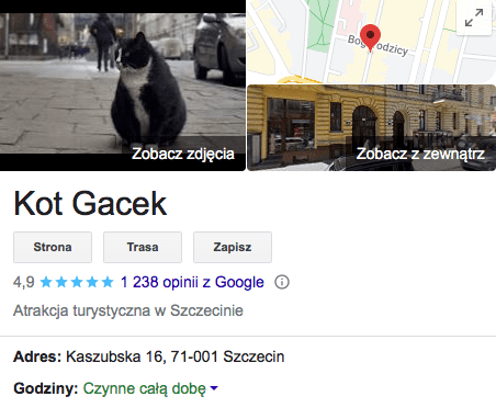 Gacka można spotkać w okolicach ul. Kaszubskiej. Opinie nie pozostawiają wątpliwości, że warto przyjechać do Szczecina choćby tylko po to, by go zobaczyć. Nawet jeśli Gacek nie będzie skłonny do interakcji. „Tak naprawdę to przyleciałem do Szczecina, żeby go zobaczyć, no i się opłacało. P.S. Najlepsza atrakcja”, „Najlepsza atrakcja w obrębie Szczecina! Polecam, warto było przyjeżdżać z Poznania”, „Przejechałem pół Polski, by go zobaczyć i było warto”, „Jedyny powód, żeby odwiedzić Szczecin”, „Warto przyjechać nawet z Dolnego Śląska (jak ja), żeby spotkać się z Gackiem” – to tylko niektóre opinie.