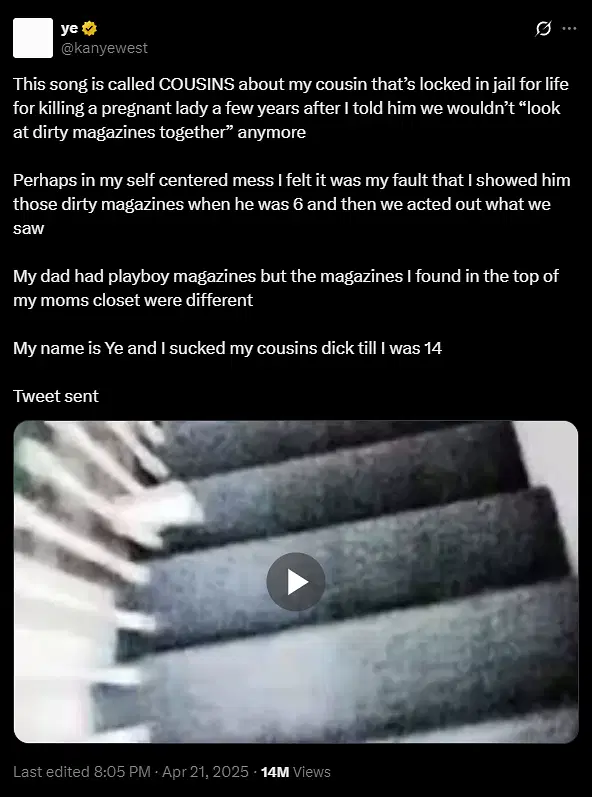 Domniemany kuzyn Westa został skazany za morderstwo kobiety w ciąży. W momencie popełniania zbrodni miał 17 lat. Szczegóły tej zbrodni owiane są jednak tajemnicą. Czy kuzyn Ye istnieje? A może to kolejny chwyt promocyjny Westa, który nie bał się publicznie wyznać, że kocha Hitlera? Wśród komentujących wielu odpowiedziało na post Ye wyrażając wsparcie, równie wiele komentarzy wskazywało na marketingowy geniusz rapera i jego umiejętność generowania treści poprzez wykorzystywanie czynnika szoku.