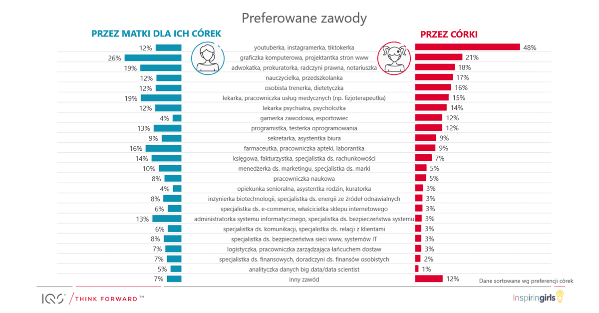 „- Zawód youtuberka nie istnieje w oficjalnej klasyfikacji zawodów GUS, dlatego nie dziwi fakt, że matki dziewczynek czterokrotnie rzadziej (12%) niż ich córki wskazywały to zajęcie jako preferowane”, komentuje Marta Rybicka, senior business director w agencji badawczej IQS.