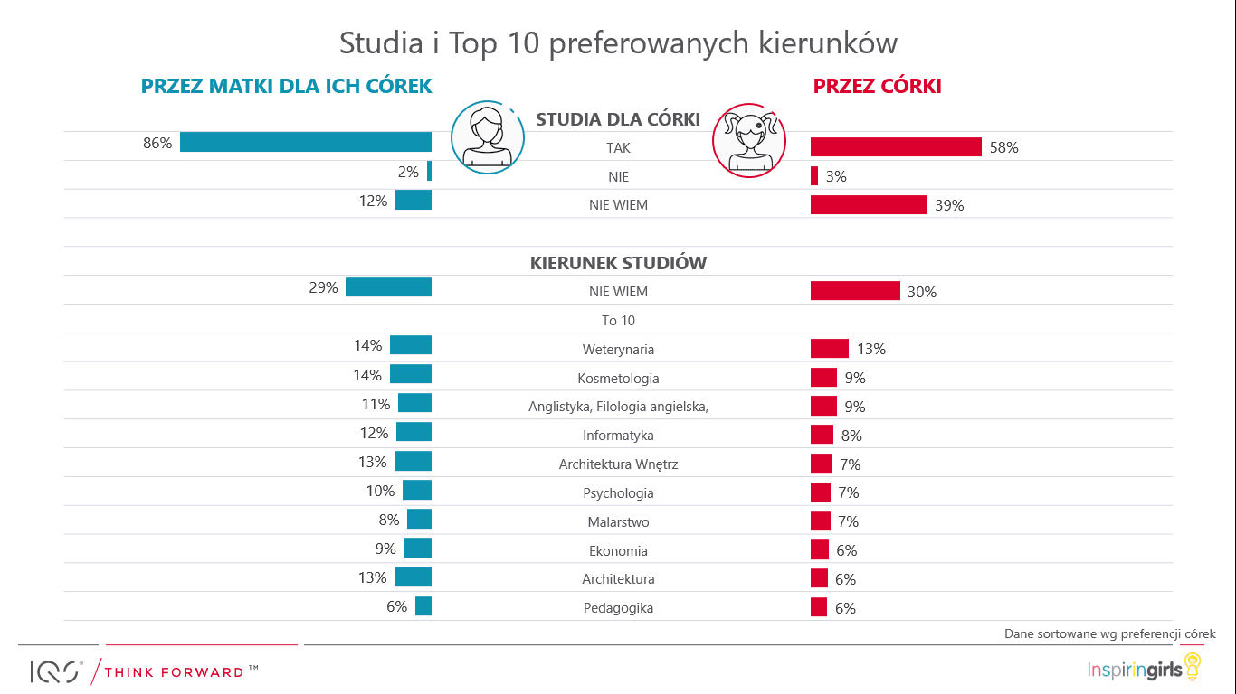 Jeżeli chodzi o studia, to 86 proc. chce aby ich córki poszły na studia wyższe. Wśród najczęściej wybieranych kierunków znalazły się m.in. weterynaria, kosmetologia, architektura, architektura wnętrz, informatyka oraz filologia angielska. Zaledwie 59 prob. córek myśli o zdobyciu dyplomu, a najczęściej wskazywane kierunki to m.in. weterynaria, kosmetologia, filologia angielska, architektura wnętrz, informatyka czy psychologia.