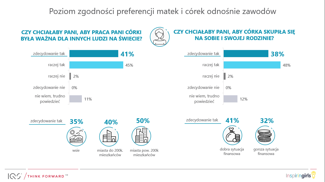 Największe różnice dotyczyły zawodu twórcy internetowego (12 proc. matek) oraz gamerki (4 proc. matek). Inne popularne w tej grupie profesje to księgowa, fakturzystka, specjalistka ds. rachunkowości, administratorka ds. systemu informatycznego oraz specjalistka ds. bezpieczeństwa systemu. Co ciekawe, aż 41 proc. matek chce, aby praca ich córek była ważna dla innych ludzi na świecie, a częściej odpowiadały twierdzącą mieszkanki dużych miast.