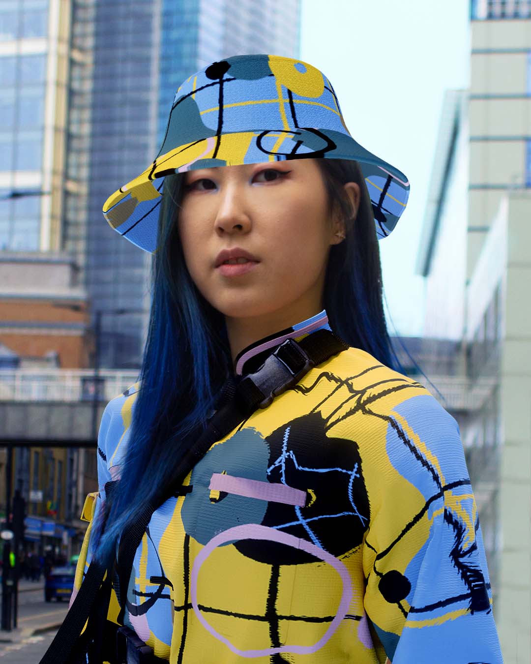 Stalowo-ceramiczny “Obiekt” Malwiny Konopackiej stał się inspiracją do zabudowanego i solidnego, wręcz technicznego looku. Połączenie stylu „roboczej” kurtki i spodni, streetstyle’owej czapki z tradycyjnym chińskim designem Magua stało się dla projektantki idealną bazą do przeniesienia oryginalnego, mocnego printu Konopackiej.
