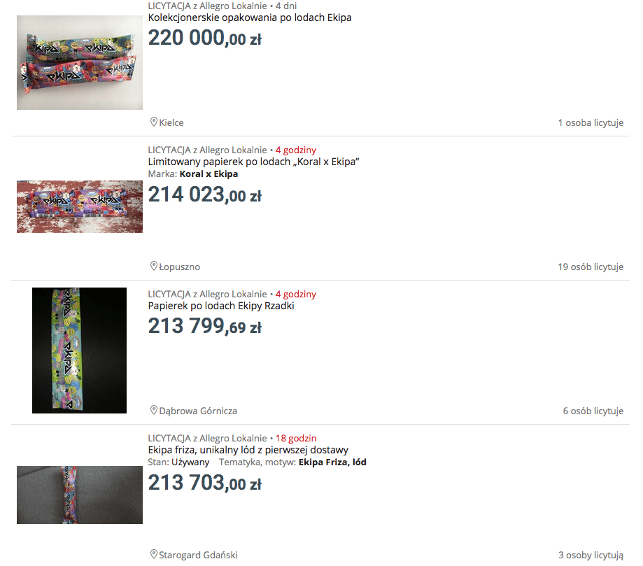 Żeby było jeszcze ciekawiej, szczęśliwi nabywcy wystawiają papierki po lodach Ekipy na Allegro i na OLX. Ceny wahają się od kilku do kilkuset tysięcy złotych, a w niektórych licytacjach bierze udział nawet kilkadziesiąt osób. Obecnie na Allegro można licytować kilkaset opakowań po lodach Ekipy. Według rzecznika prasowego Allegro licytacje należy traktować jako „żarty dzieci".