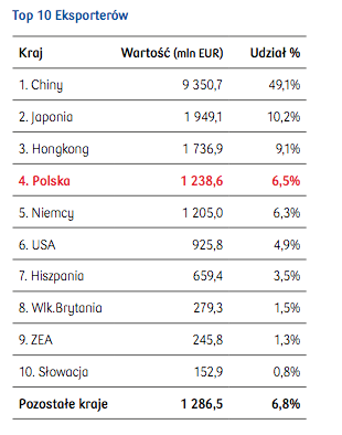 - Towary eksportowane z Polski stanowiły w 2018 r. 6,5% światowego eksportu, co daje Polsce 4. miejsce wśród dostawców konsoli i urządzeń do gier wideo [najwyraźniej zalicza się do tej dziedziny również produkcja gier - przyp. red.]. Największym odbiorcą jest Wielka Brytania, która w 2018 r. posiadała 33,1% udział w polskim eksporcie branży. Wartość światowego eksportu konsoli i urządzeń do gier wideo wyniosła 19,0 mld EUR. Liderem eksportu są Chiny, które w 2018 r. wyeksportowały towary o wartości 9,4 mld EUR, co daje jej udział w światowym eksporcie branży na poziomie 49,1% - możemy przeczytać w analizie polskich konsol i urządzeń do gier wideo w raporcie rozwoju nt. polskiego eksportu PKO BP.