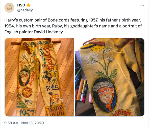 Wokalista był fanem angielskiego artysty, rysownika i fotografa na długo przed spotkaniem z nim. W 2020 roku muzyk nosił spodnie z ręcznie malowanym sztruksu marki Bode, na których znajdowała się ilustracja Hockneya autorstwa artystki Aayushii Khowala.
