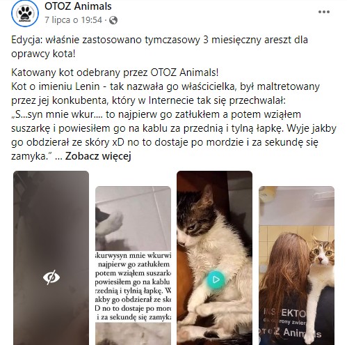 Niedługo później udało się ustalić jego tożsamość. „Katem okazał się 22-letni mężczyzna mieszkający w Gdyni" – poinformował Dioz na InstaStories. Sprawa trafiła na policję za sprawą... właścicielki kota oraz partnerki Kacpra B, która przekazała, że znęcał się nad kotem od pół roku. Rodzina mężczyzny miała wyrzucić go z domu, gdy dowiedziała się o tym, co zrobił.