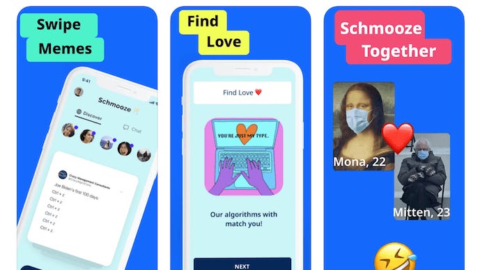 Schmooze jest aplikacją randkową, w której język miłości opiera się na memach. Wykorzystuje ona strukturę starego dobrego Tindera, lecz zamiast ludzi „swipuje” się memy. Aplikacja zdobywa coraz większą popularność szczególnie wśród generacji Z.