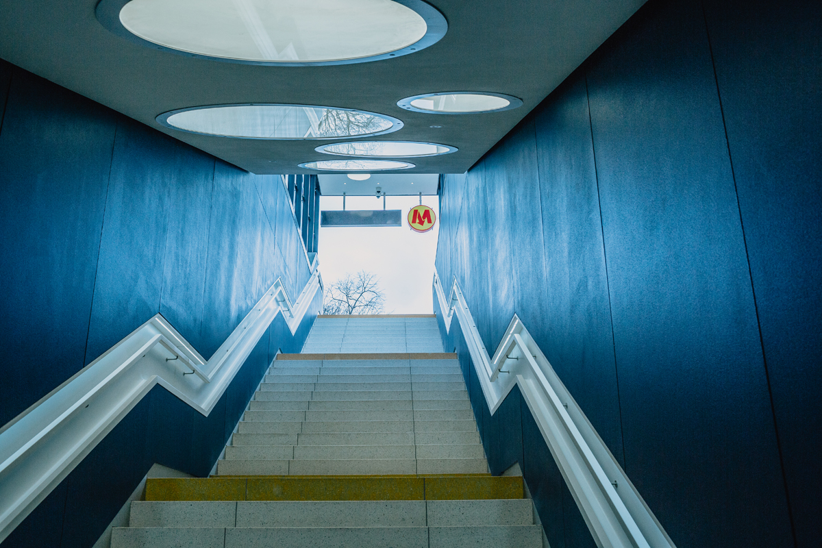 Zależało nam na tym, żeby już wjeżdżając na stację pasażer dobrze wiedział, gdzie jest. Dobrym przykładem będzie tu stacja Młynów. Każdy pasażer zauważy powtarzający się w wystroju stacji motyw koła. Jest ono zawarte w naprawdę wielu elementach. Tym najbardziej oczywistym, bo rzucającym się w oczy od pierwszej chwili jest neon z nazwą stacji. Jeśli mówimy o detalach, neon ten zasługuje na oddzielny rozdział. Pragnęliśmy, aby sprawiał wrażenie przyjaznego i bardzo miękkiego. Żeby osiągnąć zamierzony efekt, zaprojektowaliśmy całą typografię mając na myśli właśnie tę jego przyjazną krągłość. Idąc dalej tropem szczegółów, nawet na poziomie antresoli, czyli tam, gdzie zwykle sprzedaje się zapiekanki, rajstopy i bilety, wprowadziliśmy motywy koła. W tym wypadku mowa o ogrodzeniu strefy biletowej. Zdecydowaliśmy się na przezroczyste szklane obudowy. Żeby jednak nikt na nie nie wpadał przez przypadek, oznaczone zostały niebieskimi kółkami pasującymi do identyfikacji wizualnej stacji Młynów. Podobnie zrobiliśmy z pawilonami wejściowymi do metra. Chodzi o to, żeby nawet ludzie, którzy nie znają Warszawy albo przysypiają w komunikacji miejskiej zorientowali się gdzie są, przelotnie rzucając okiem. Temu właśnie służy mocna identyfikacja wizualna.