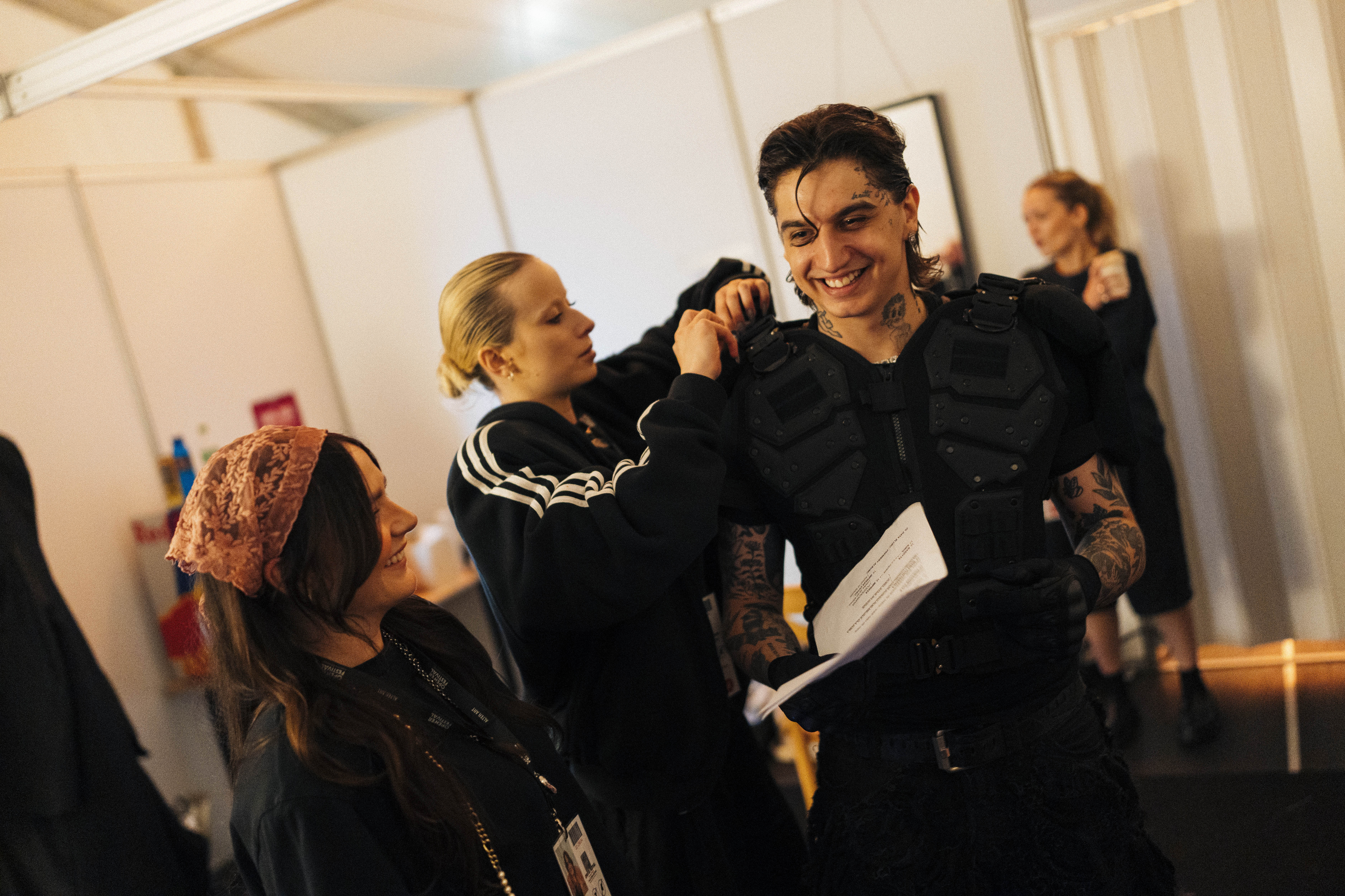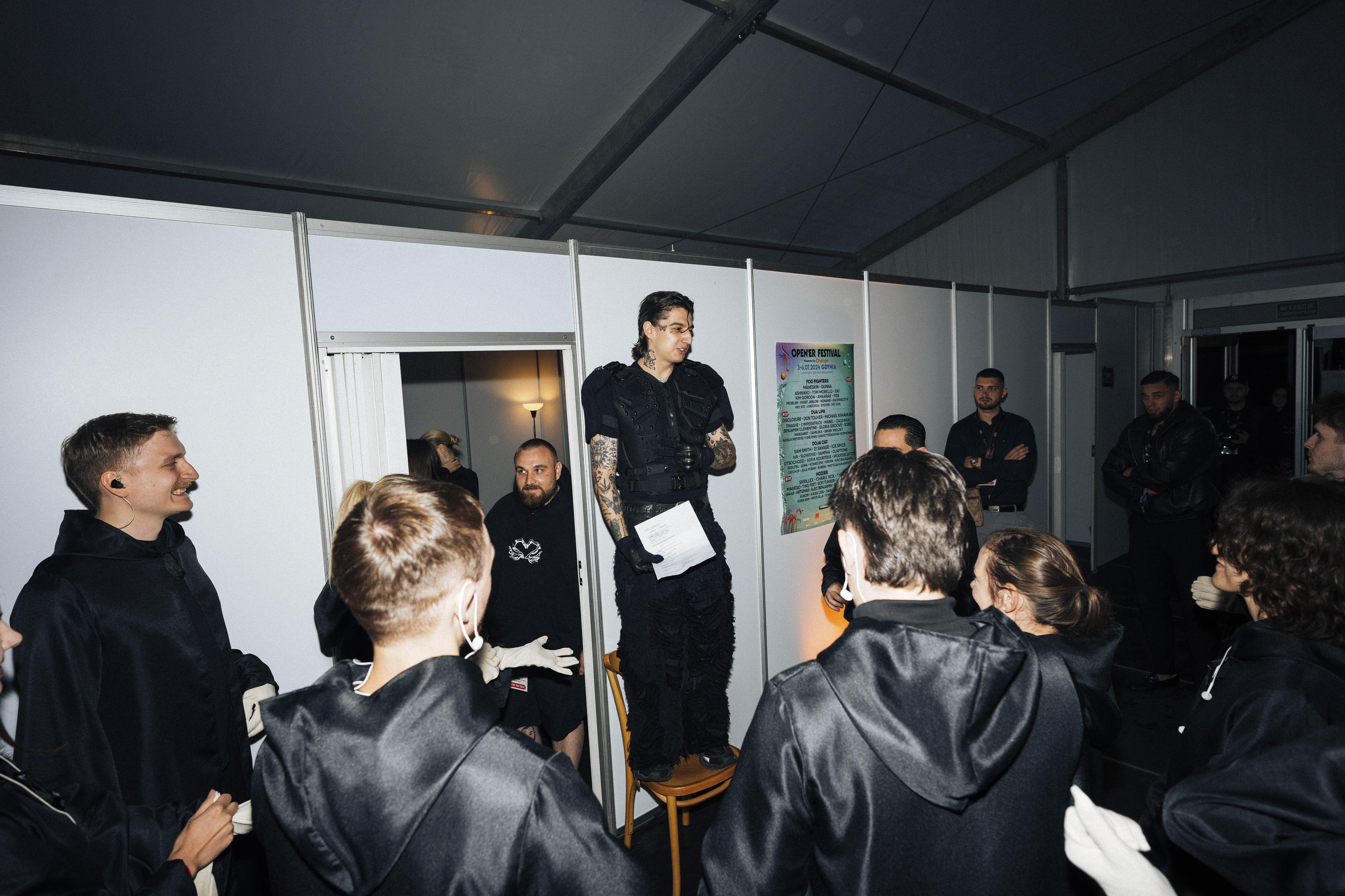 Chwilę przed północą garderoba Sobla wypełniła się ludźmi. W jego otoczeniu nie ma nikogo przypadkowego. Najbliższą część teamu artysty stanowią bliscy z jego rodzinnego miasta — Świdnicy. Z pozostałymi pracuje od lat. Te chwile przed koncertem poświęca na ostatnie szlify i domknięcie swojej roli. Poprawki włosów, przebranie w stylizację — w przypadku tej trasy naprawdę trudną i ciężką do ogarnięcia na scenie — studiowanie set listy, ułożenie listy tematów, które chce na scenie poruszyć. A w trakcie show Sobel jest prawdziwą gadułą i z łatwością przychodzi mu kontakt z fanami. W ostatnich minutach przed koncertem, gdy wszyscy gromadzili się już przy wyjściu, chwycił krzesło, na którym stanął, żeby powiedzieć jeszcze coś od siebie. Przypomnieć kilka kwestii, podbudować, podziękować. „To wasze zaangażowanie popycha mnie do tworzenia lepszych rzeczy” — zwrócił się do zespołu.