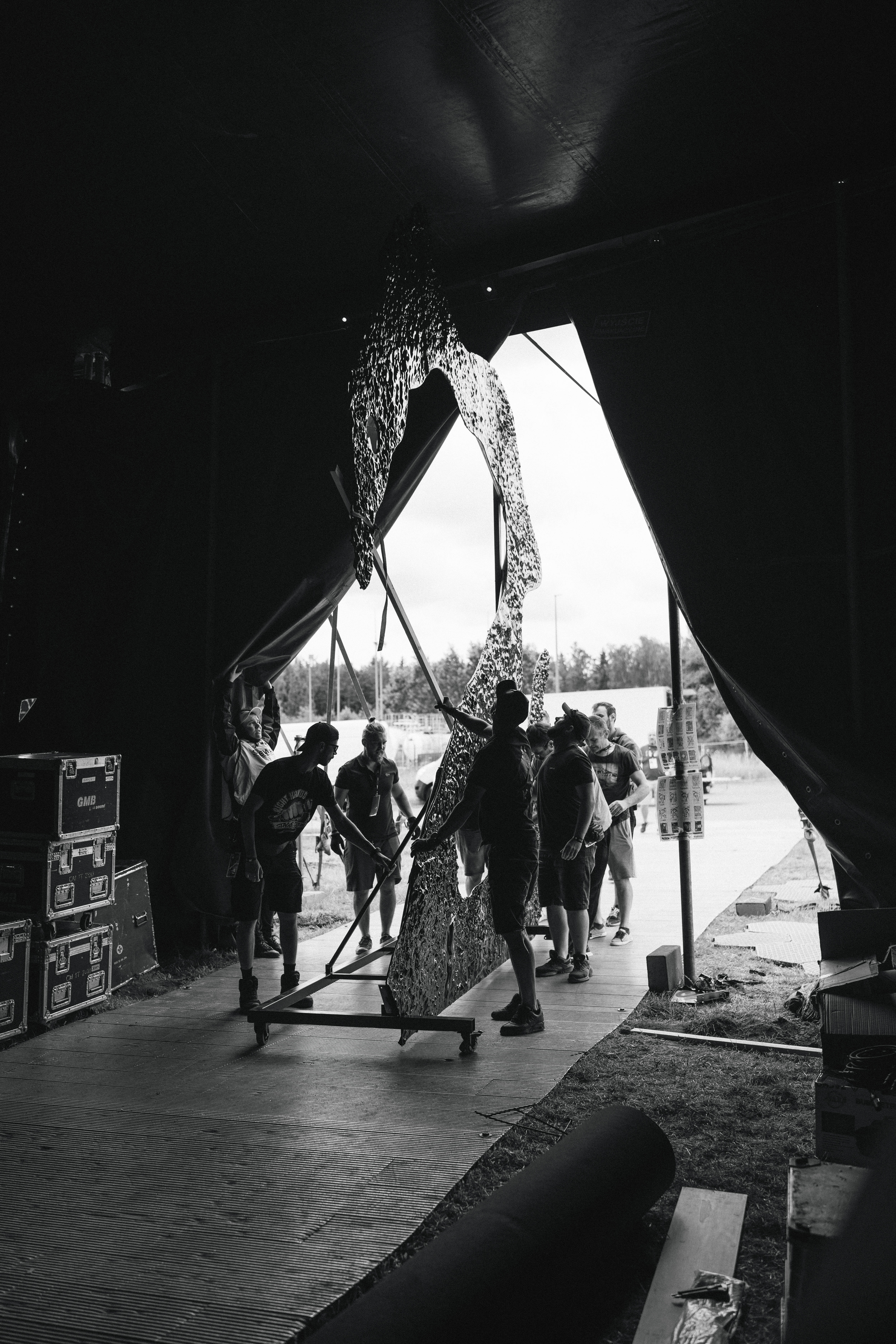 Za kulisami Open'erowego tentu panował względny ład. Chwilę po godzinie 10 wjechało tam kilka ciężarówek ze wszystkim, co potrzebne do realizacji całego przedsięwzięcia. Setki dokładnie opisanych skrzyń z mikserami, kablami, mikrofonami, światłami i elementami naprawdę wyjątkowej scenografii. Próba rozpoczęła się prawie punktualnie, chwilę po zejściu ze sceny Tinashe i jej tancerzy. Czas przewidziany na „przeinstalowanie” artystów na scenach festiwalu to dosłownie kilka chwil, co oznacza, że część prób również powinna utrzymywać szybkie tempo.
