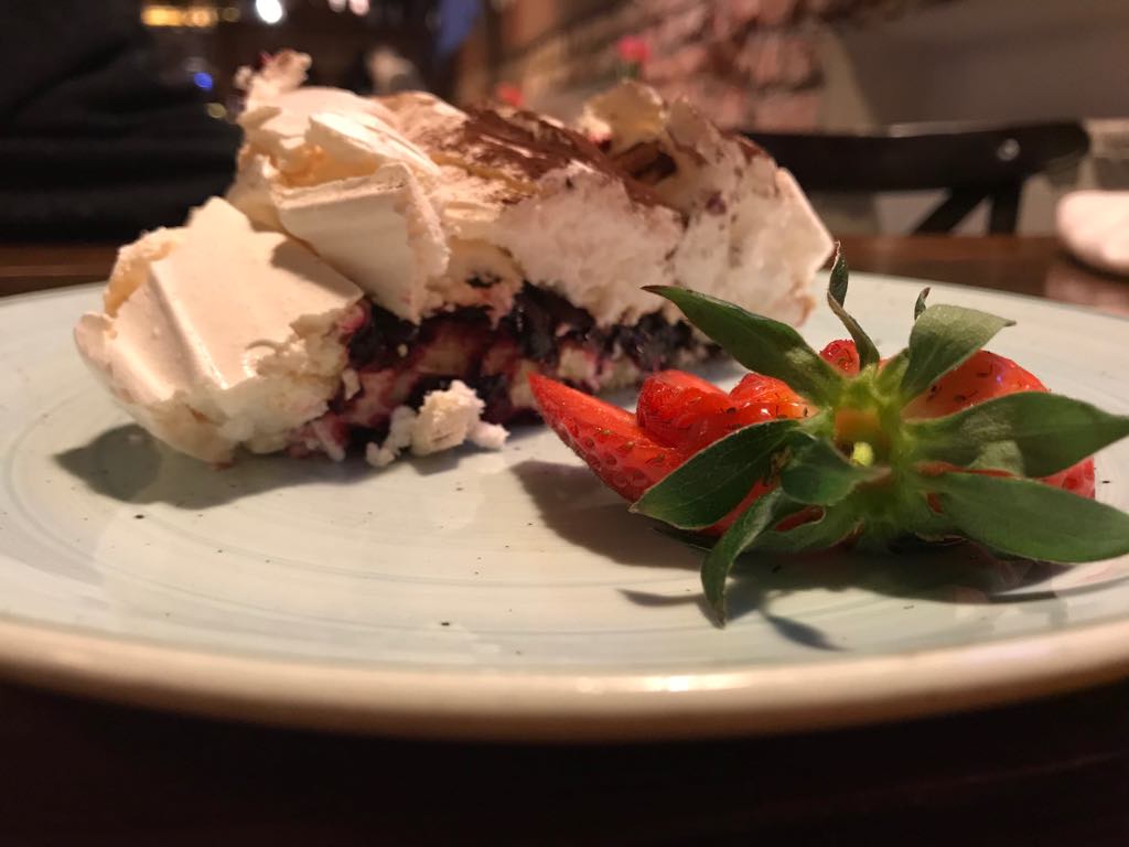 Pełni szczęścia nie potrafimy się powstrzymać przed deserem. Udając skromnych, zamawiamy jedną bezę na pół. Jeszcze nie wiemy, że będziemy sobie gratulować tej decyzji za piętnaście minut. Gigantyczna beza, piękna i bogata, pozwala nam zamknąć wieczór absolutnym rozmarzeniem.
