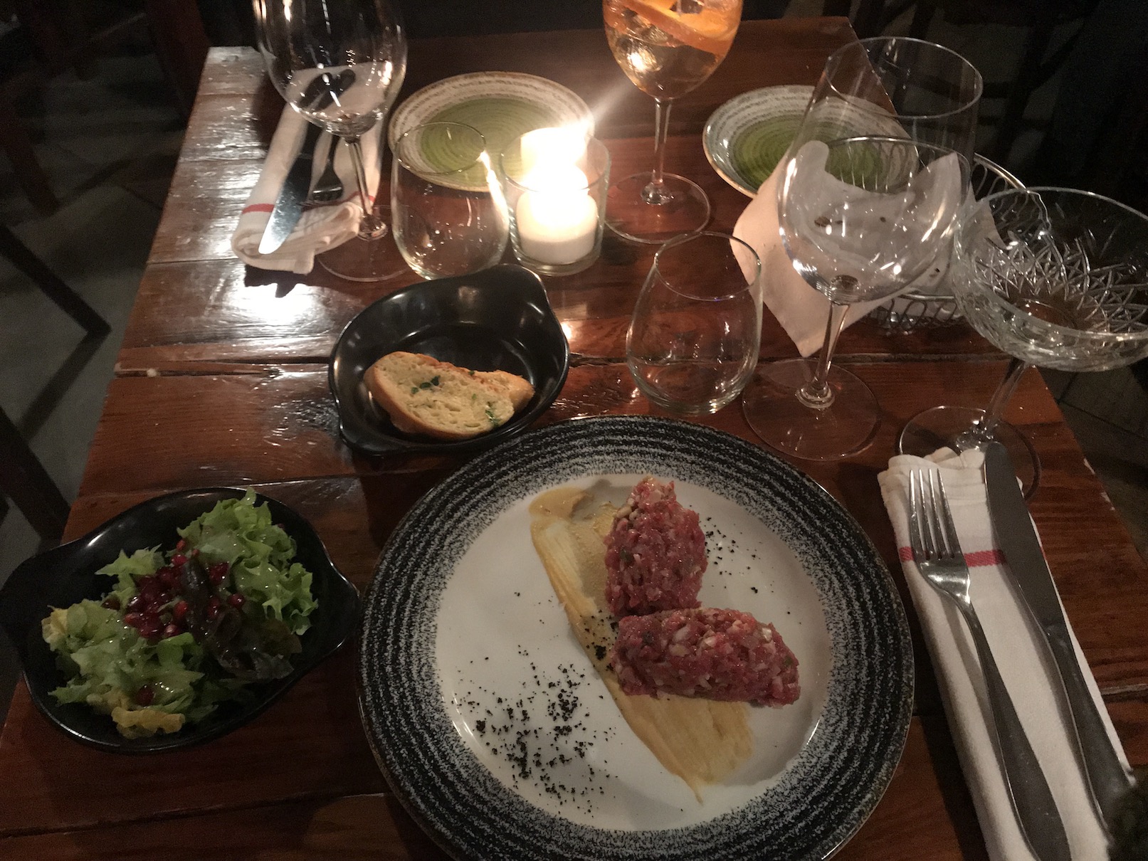 Na początek zamawiamy befsztyk tatarski siekany przy stole i słynną już zupę rybną à la bouillabaisse.