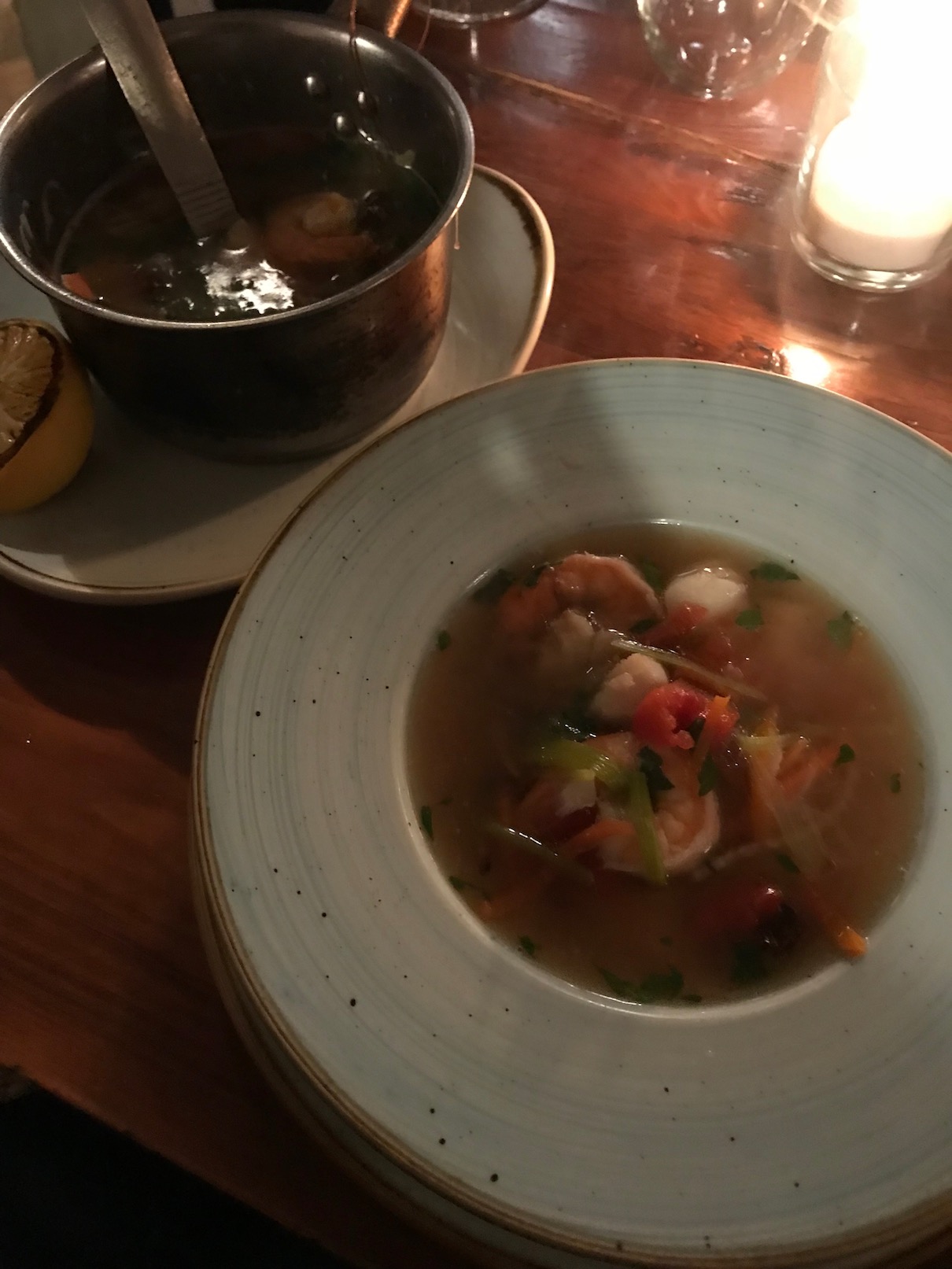 Tatar, spektakularnie przygotowywany obok stolika, robi wrażenie i zachęca do dzielenia się tym szczęściem. Z radością go pochłonęłam, a następnie podskubywałam zupę rybną partnera, która została królową naszego wieczoru. Wywar klarowny i piękny, esencjonalny i pachnący żywym morzem (szumiał nam w uszach z wrażenia). Pełen dobrodziejstw dalekich mórz powala na kolana. Porcja nader słuszna pozostawiła na naszych twarzach błogi uśmiech.