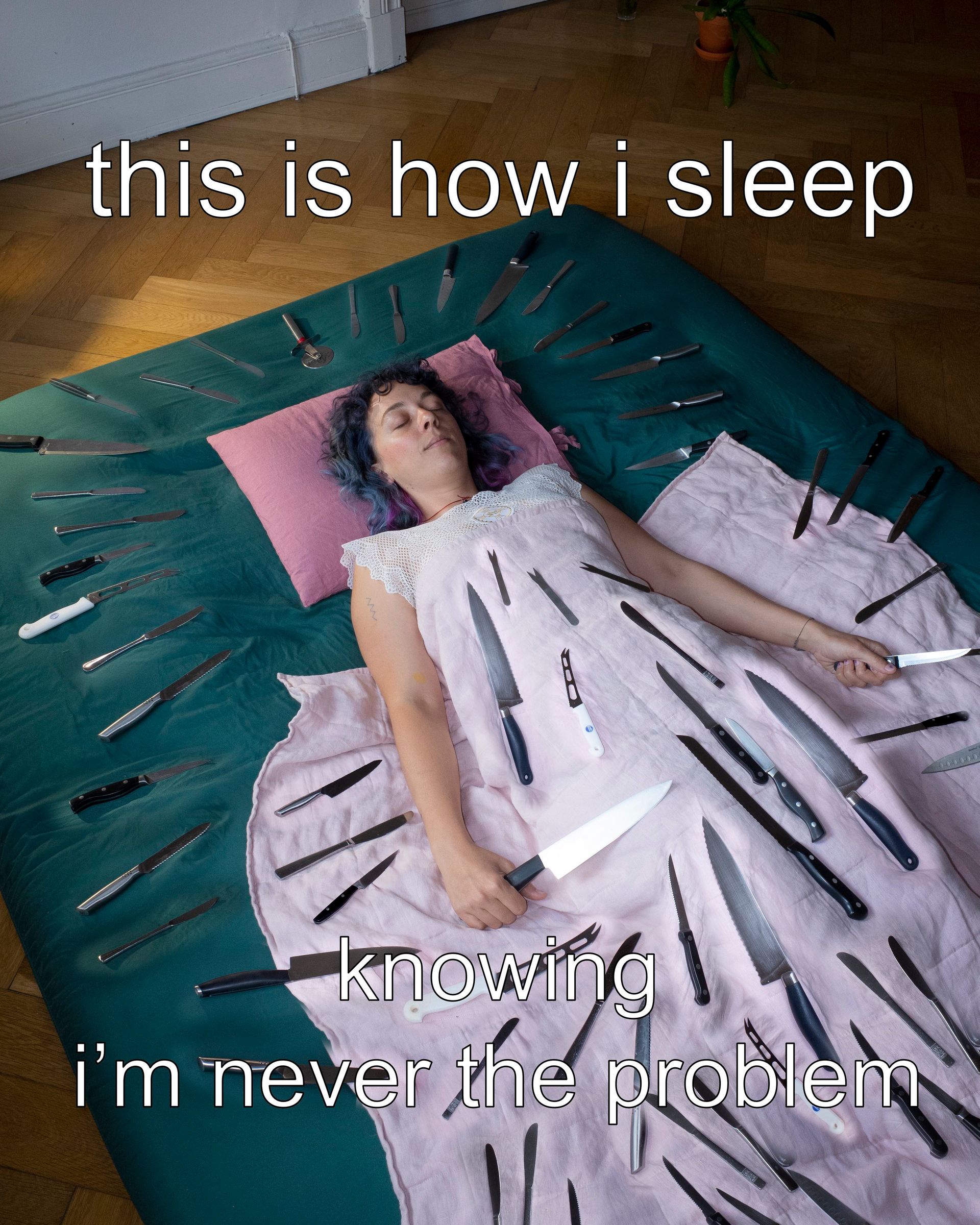 Myślę, że nie da się wymazać pięciu lat życia. Wykształcenie prawnicze na pewno wpływa na moją sztukę, czego dobrym przykładem jest seria HOAX. Studiowałam prawo w latach 2011-2016, ale już w 2014 roku wiedziałam, że nie pójdę tą drogą. Zapisałam się wtedy na dwuletni kurs fotografii w OPT Wrocław. Nie chciałam funkcjonować w świecie stworzonym przez kogoś innego, wolałam tworzyć własne światy, a fotografia była ze mną od dawna, pamiętam sesje zdjęciowe z koleżankami w szkole, fotografowanie wszystkiego aparatami, telefonami, wcześniej analogami. Kupiłam mały aparat na klisze, uczyłam się, fotografowałam do granic obsesji. W międzyczasie przyszedł kryzys demokracji w Polsce, zalew postprawdą, uwidoczniła się absurdalna siła polityczna Kościoła katolickiego, uświadomiłam sobie opresję państwa i moc patriarchatu. Niepokoiło mnie powolne przejmowanie instytucji przez osoby bez kompetencji, psucie prawa. Czytanie informacji w mediach i oglądanie zamieszczanych tam obrazów wpływało na mój proces twórczy, a dzięki świadomości prawniczej mogłam lepiej zrozumieć kryzys polityczny i szybciej na niego zareagować artystycznymi narzędziami. W serii HOAX używam fotografii zmieszanej ze źle wykonanymi w Photoshopie kolażami. W 2020 roku wydałam swoją pierwszą książkę o tym samym tytule. Pierwsze zdjęcie zamieszczone w publikacji pochodzi z 2016 roku. Wykończył mnie kilkuletni proces pracy, ale było warto. Wydanie okazało się sukcesem, otrzymało wyróżnienia w kilku międzynarodowych i polskich konkursach na książkę fotograficzną. HOAX objechał świat. Wyprzedał się w kilka miesięcy, a ja jestem dumna, że udało mi się wykonać fotografie, kolaże, zaprojektować publikację i ręcznie wykonać okładki, ogarnąć druk, kampanię crowdfundingową, dystrybucję oraz promocję. Klamrą zamykającą HOAX została próba cenzury tej pracy ze strony Instytutu Polskiego w Paryżu, kiedy pokazywałam serię na festiwalu Circulation(s) w 2022 roku. W proteście natychmiast odpowiedziałam pracą „Take Down”, nagimi autoportretami, na których ocenzurowałam swoją nagość, wykonanymi w tym czasie w budynku Instytutu Polskiego. Ze strony praktycznej jako artystce po prawie zapewne trochę łatwiej mi czytać umowy, choć równie często się z nimi zmagam.