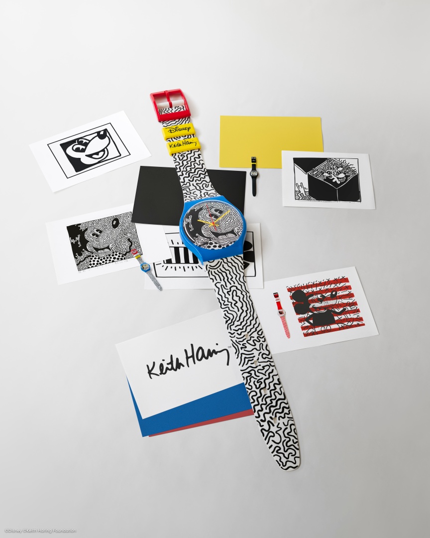 Ponoć Haring, pionier street artu, zawsze chciał pracować dla Disneya i w pewnym momencie postanowił wziąć sprawy w swoje ręce, a postać Myszki Miki często powracała w jego dziełach. Najnowsza kolekcja Swatch to druga przygoda marki z Keithem Haringiem. Pierwsza miała miejsce w 1986 r., kiedy artysta zaprojektował cztery zegarki przed otwarciem kultowego Pop Shop przy Lafayette Street w centrum Nowego Jorku. Modele były tam sprzedawane w limitowanej edycji i do dziś pozostają jednymi z najchętniej kolekcjonowanych zegarków Swatch. Obecnie to, co przyciąga uwagę intensywnymi kolorami czy wzorami, pozostaje zapamiętane na dłużej, a model MOUSE MARINIÈRE to wyrazisty zegarek z wytrzymałym, czerwonym paskiem, którego kolorystyka powstała z inspiracji kultowymi spodenkami Myszki Miki. Ilustracja Haringa, przedstawiająca najsłynniejszą postać Disney, zdobi szkiełko zegarka, a część projektu znajduje się na tarczy, nadając ilustracji dodatkową głębię i ruch.