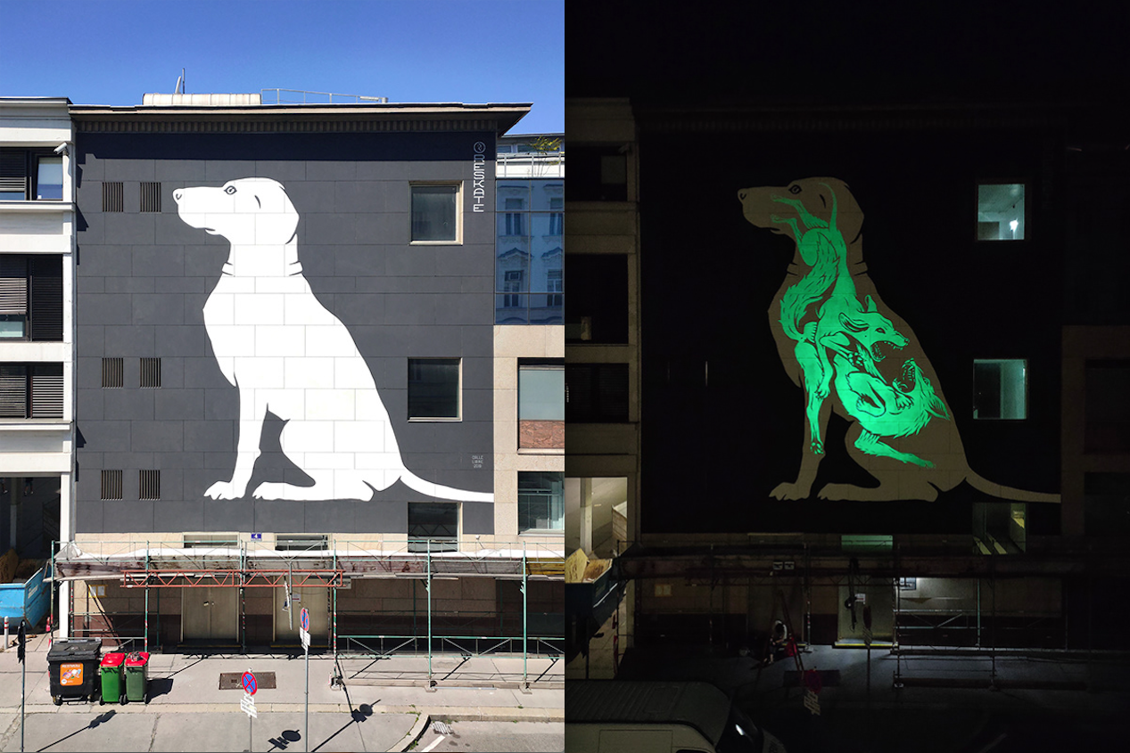 Kolejny mural pojawił się w Wiedniu. „Domestication” przedstawia szacunek i uznaniedla wiedeńskiejrasy psa: gończegotyrolskiego. Od dawna jest on wykorzystywany przez ludzi do tropienia lisów. W nocy sylwetka psa odkrywa dwa walczące ze sobą lisy.