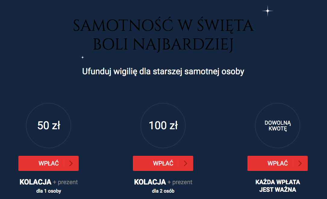 Co można zrobić? Na stronie internetowej Podaruj Wigilię istnieje możliwość ufundowania Wigilii dla starszej, samotnej osoby oraz dokonania wpłaty w wysokości 100 (kolacja plus prezent dla dwóch osób) lub 50 złotych (kolacja plus prezent dla jednej osoby). Jeśli ktoś nie może pozwolić sobie na taki wydatek, może wesprzeć inicjatywę dowolną kwotą. screen ze strony Podaruj Wigilię