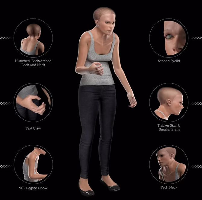 Dziesiątki lat pochylania się nad ekranem laptopa lub smartfona sprawią, że na ludzkich plecach pojawi się garb, a szyja, określona jako „tech-neck”, wyraźnie się skróci. Nasza dłoń zostanie uformowana tak, aby konsekwentnie podtrzymywać smartfon, stąd kciuk zmutuje w „piszący szpon”, który przez większość czasu uderza w ekran urządzenia – szpon jest twardszy i zakrzywiony. Ze względu na ułożenia ramienia podczas trzymania telefonu, łokcie ludzi z przyszłości będą z kolei ustawione na stałe pod kątem 90 stopni. Na ostateczny kształt modelu wpłynęła również teoria badaczy, według której człowiek wykształci podwójne powieki. To z kolei ma chronić nasze gałki oczne przed szkodliwym światłem ekranów urządzeń mobilnych i stacjonarnych.