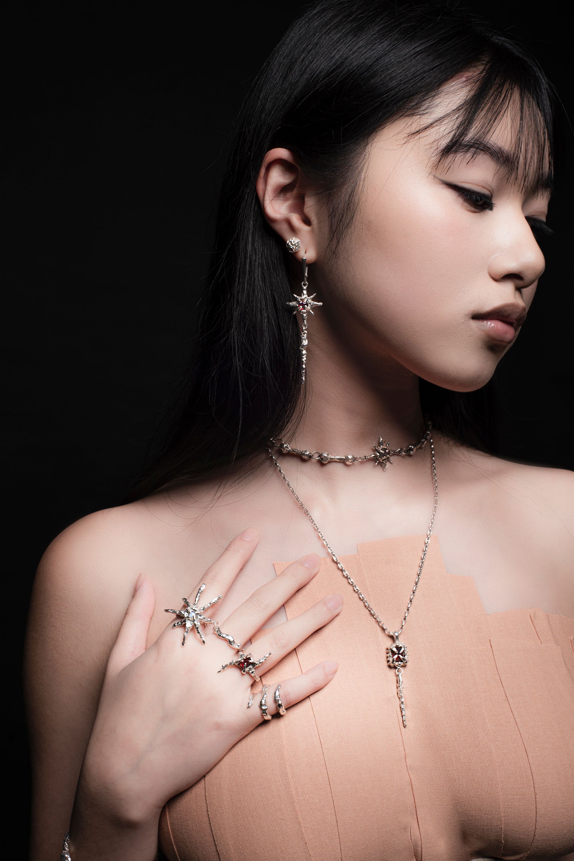 Jak mówi Oliwia Skrzypaszek, „bez kilograma srebra na szyi” nie rusza się z domu. Biżuteria to jej źródło motywacji i pewności siebie. Puszka 925 to jej autorski brand, który zrodził się w 2011 roku, choć jeszcze nieuświadomiony. Podczas niepozornej parodii na obozie szkolnym, gdy koleżanka chciała przedstawić Oliwię jak najbardziej wiarygodnie, nie szczędziła zdobień z bibuły mających „udawać” biżuterię. Już wtedy ten rodzaj maksymalizmu był bliski Skrzypaszek. Więcej – budował jej tożsamość. Za nazwą kryje się pieszczotliwy zwrot, którym obdarował ją narzeczony, a estetykę ręcznie tworzonych kolczyków, pierścionków i naszyjników trudno zaszufladkować. Na wskroś tajemnicza, okraszona mrokiem, nieco awangardowa… Wszystkie elementy Puszki 925 mają być jak osobiste talizmany, trzymane blisko ciała, serca. „Kontrast” to słowo-klucz, a osoby bliskie projektantce to puzzel, który sprawia, że cała układanka nabiera sensu.