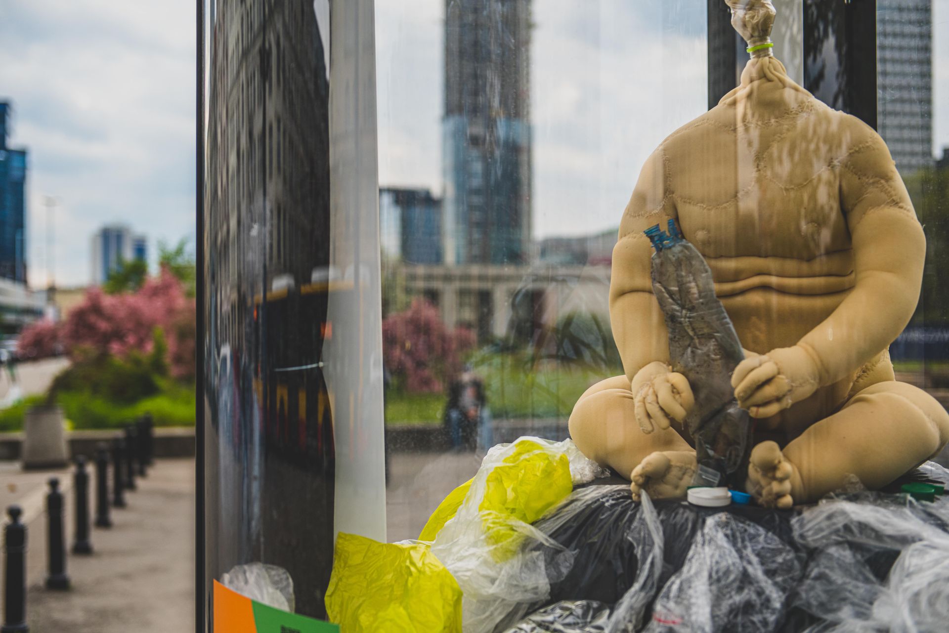 Aranżacja została stworzona z wykorzystaniem przedmiotów jednorazowego użytku – rękawiczek, plastikowych butelek, maseczek, folii. Wśród nich stoją rzeźby przypominające ludzi. Sztuka, którą chętni zwykle oglądają w czterech ścianach instytucji kulturalnych, tym razem jest dostępna dla każdego. Bo w tym przypadku dotyczy nas wszystkich bez wyjątku. To zasługa Galerii Promocyjnej, która postanowiła w niekonwencjonalny sposób wykorzystać słupy reklamowe i stworzyć z nich swego rodzaju gabloty wystawiennicze. Ewa Dąbrowska w swoich rzeźbach pokazała, jak zniszczenie środowiska wygląda z punktu widzenia jego ofiar, bezbronnych i niemających głosu, zwierząt oraz ubogich ludzi z zalewanych naszymi śmieciami krajów globalnego Południa. Pandemia sprawiła, że ta rzeczywistość jest coraz bardziej odczuwana również przez nas, mieszkańców uprzywilejowanych części globu.