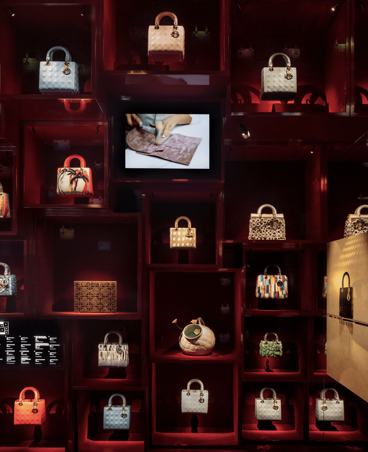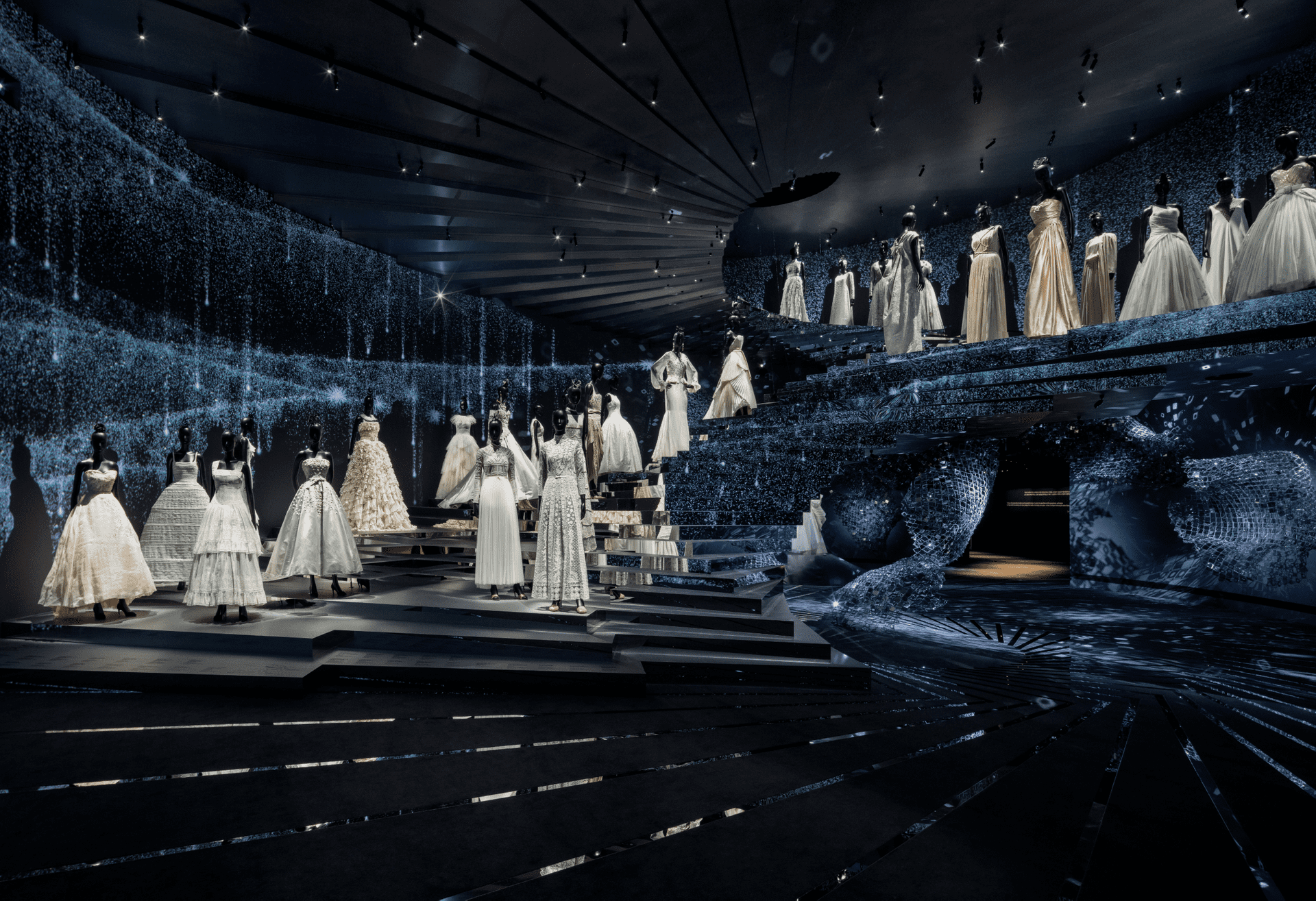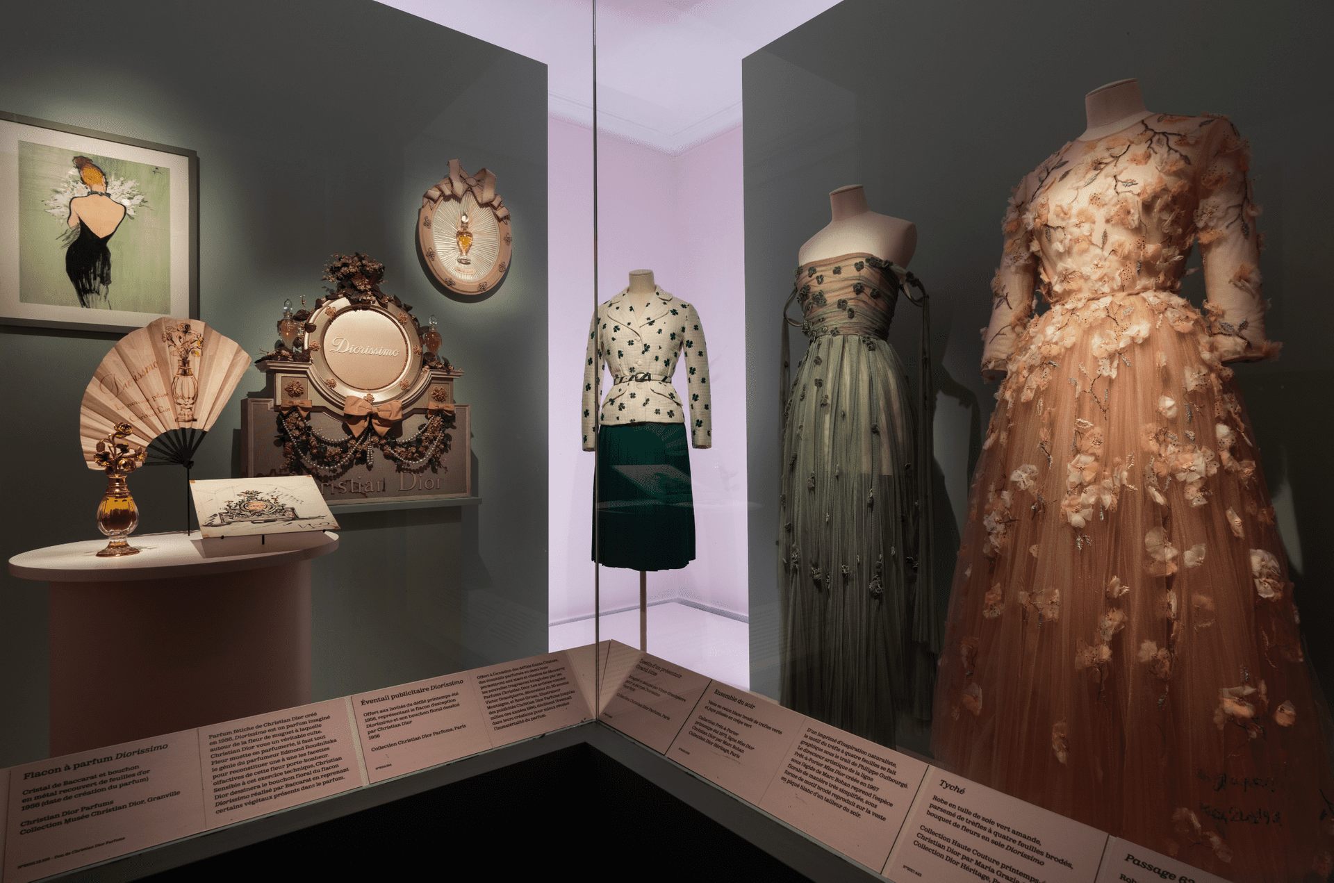 Wystawa w La Galerie rozpięta jest między ruchem a precyzją – trzynaście sekcji prowadzi przez ogrody, bale, haute couture i prêt-à-porter, każda niczym osobny akt spektaklu. A jednak najpełniej wybrzmiewa to, co z pozoru poboczne – Chambre aux merveilles, intymny kabinet osobliwości, w którym każdy detal wydaje się podsłuchanym szeptem z atelier. I J’Adore, nie tyle jako zapach, co jako pulsująca obecność – jak światło przesączające się przez tkaninę.