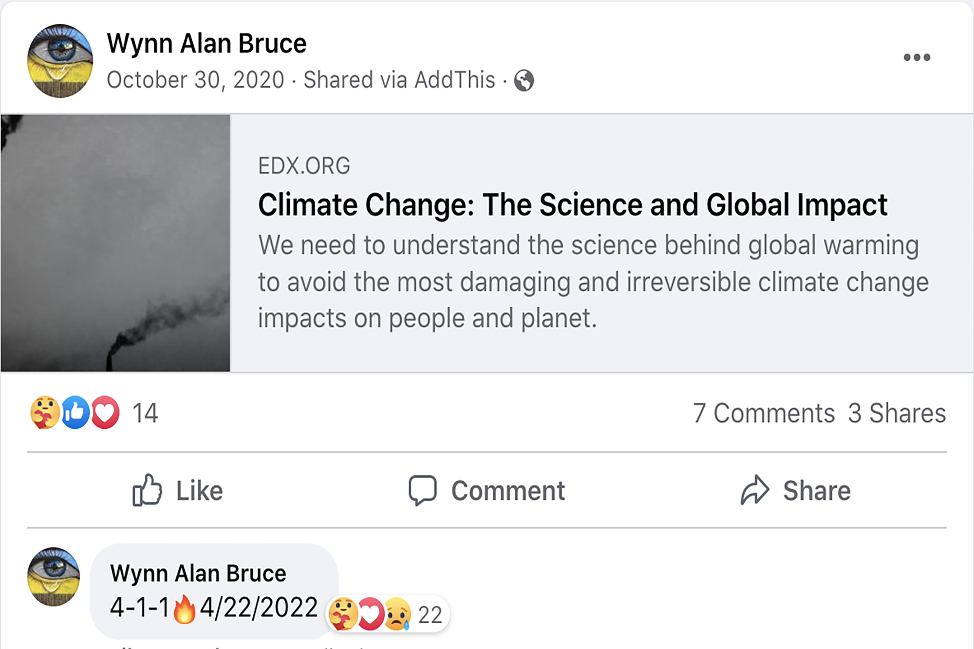 Poza zabójstwami, co roku dochodzi również do przypadków publicznych samobójstw osób związanych z walką klimatyczną. W kwietniu tego roku 50-letni Wynn Bruce, podpalił się w trakcie obchodów Dnia Ziemi przed budynkiem Sądu Najwyższego Stanów Zjednoczonych w Waszyngtonie. Na jego profilu na Facebooku znaleziono wpis z 2020 roku – emotikonę ognia i datę 4/22/2022, która okazała się datą jego samobójczej śmierci. Wydarzenie pojawiło się wyłącznie jako wzmianka w kilku lokalnych, amerykańskich mediach.