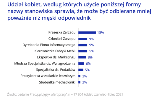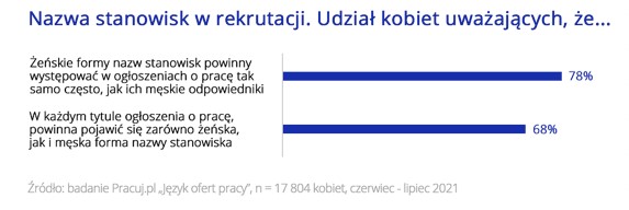 Badanie „Język ofert pracy” pokazuje, że aż 83 proc. kobiet popiera wykorzystywanie żeńskich odmian wykonywanych przez nie zawodów, ale uważa, że nazwy stanowisk takich jak „prawniczka", „psycholożka" czy „programistka" powinny być używane w formie męskiej. Dodatkowo, prawie 80 proc. chce mieć wpływ na nazwę stanowiska i oczekuje feminatywów w ogłoszeniach o pracę.