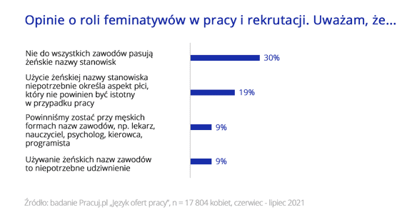 „– Feminatywy, czyli żeńskie formy gramatyczne nazw zawodów, stanowisk lub funkcji, stały się tematem badania, bo są poddawane częstym dyskusjom. Wyniki stanowią wyraźny sygnał, że w opinii kobiet feminatywy w miejscu pracy pełnią ważną rolę i powinny być uwzględniane przez pracodawców”, wyjaśniła Aleksandra Skwarska, ekspertka Pracuj.pl, w rozmowie z Agencją Informacyjną Polska Press.